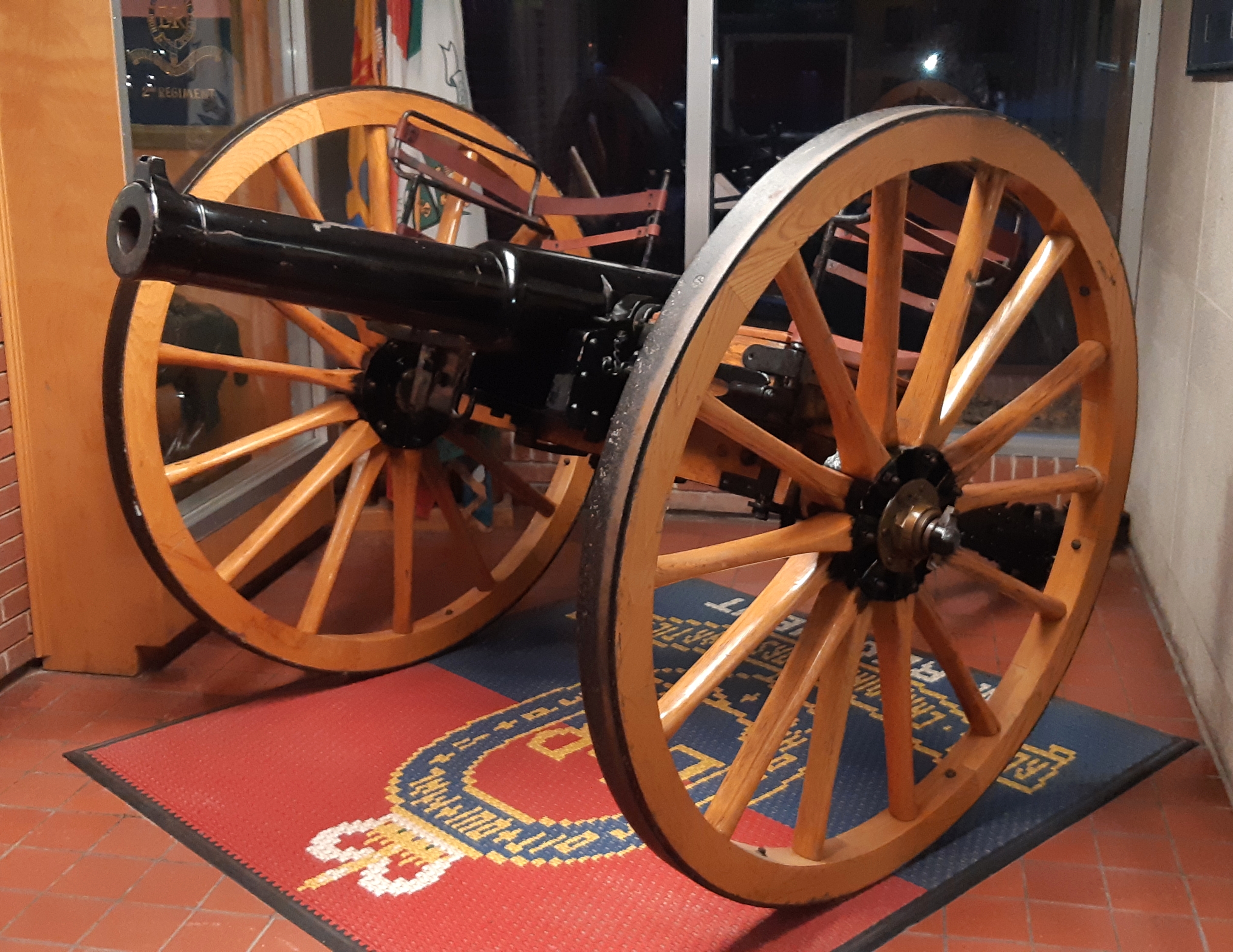 Designed in 1871, the 9-pounder rifled muzzle-loading (RML) gun was the standard artillery weapon in Canada during the last quarter of the nineteenth century. It was mounted on a varietyof field and garrison (fortification) carriages, depending on the role of the unit. It was also mounted on gun sleighs for transport in the winter.The 9-pounder RML was used during the 1885 Riel rebellion. In 1885, A and B Batteries under command of LCol C.E. Montizambert, with four guns and a combined strength of 219 officersand men of the permanent force artillery, joined Major General Sir Frederick Middleton’s column. B Battery, commanded by Maj G.J. Short, went with LCol William Otter’s column. A Battery, with its two 9-pounders was the first of the Regiment to see action at Fish Creek, where a skirmish with a heavily defended Metis position resulted in great praise being given to gunners.