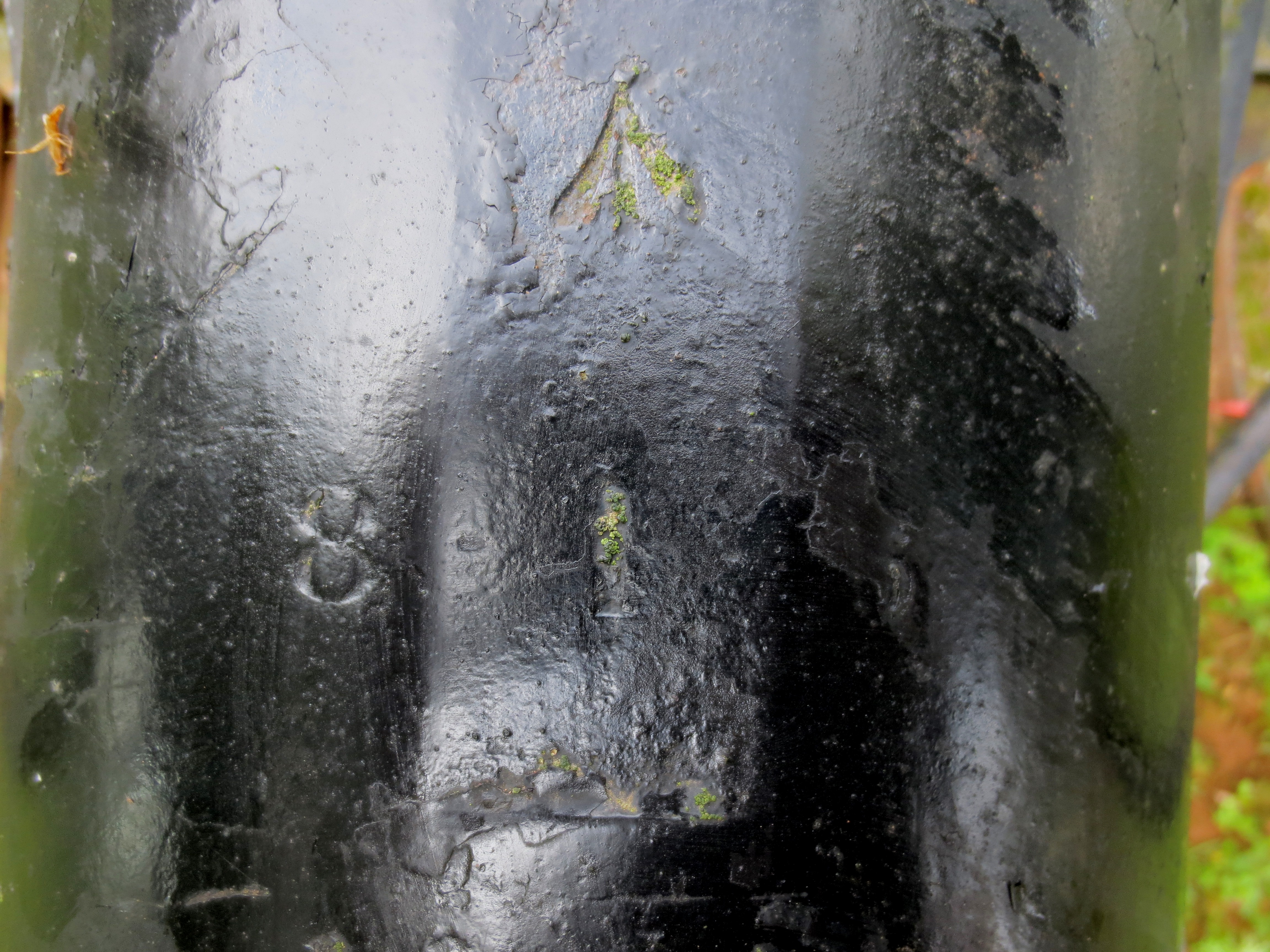 9-pounder 8-cwt Muzzleloading Rifle Mk. II, weight 8-1-13 (937 lbs), (RGF No. 2850, 1873) on the left trunnion, unmounted, stamped Sir W.G. Armstrong and Co., Newcastle on the Tyne. This gun was a bollard that stood in front of the Ottawa Armouries. It is corroded forward of the trunnions.