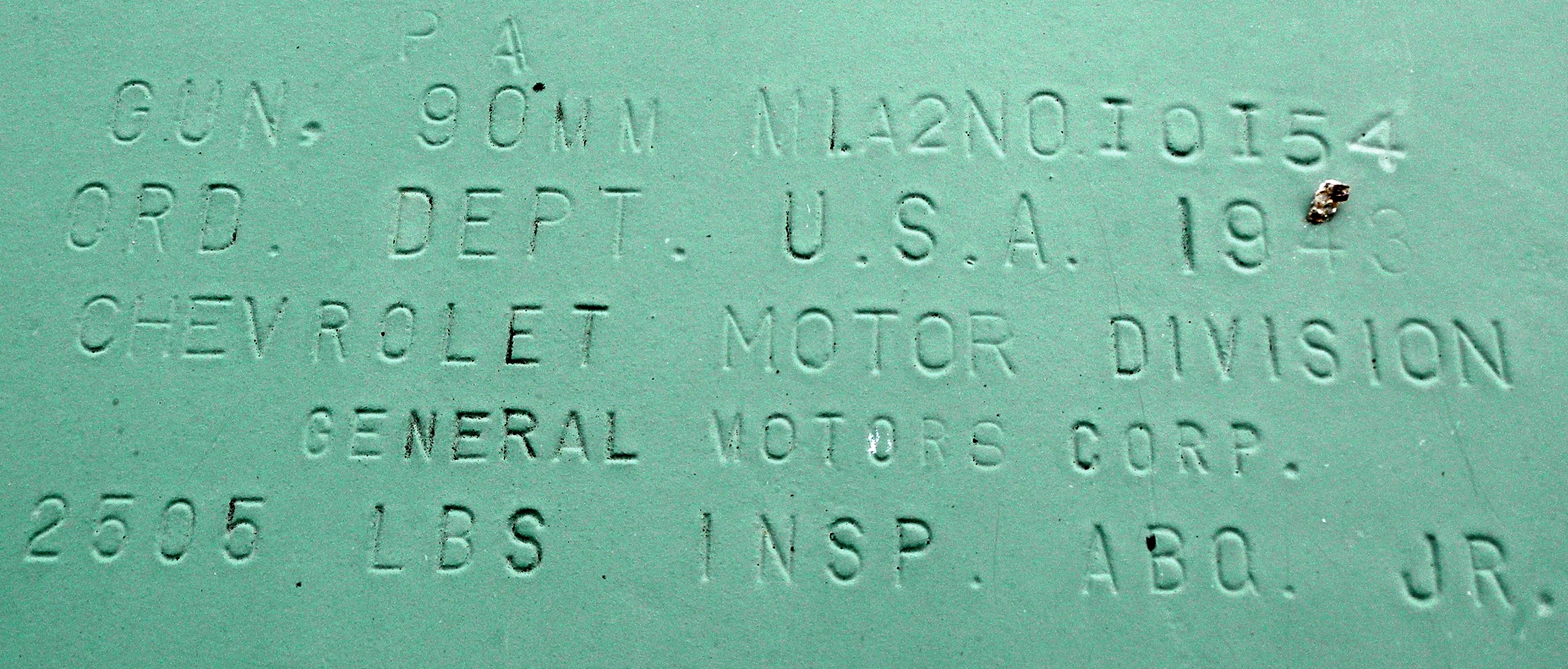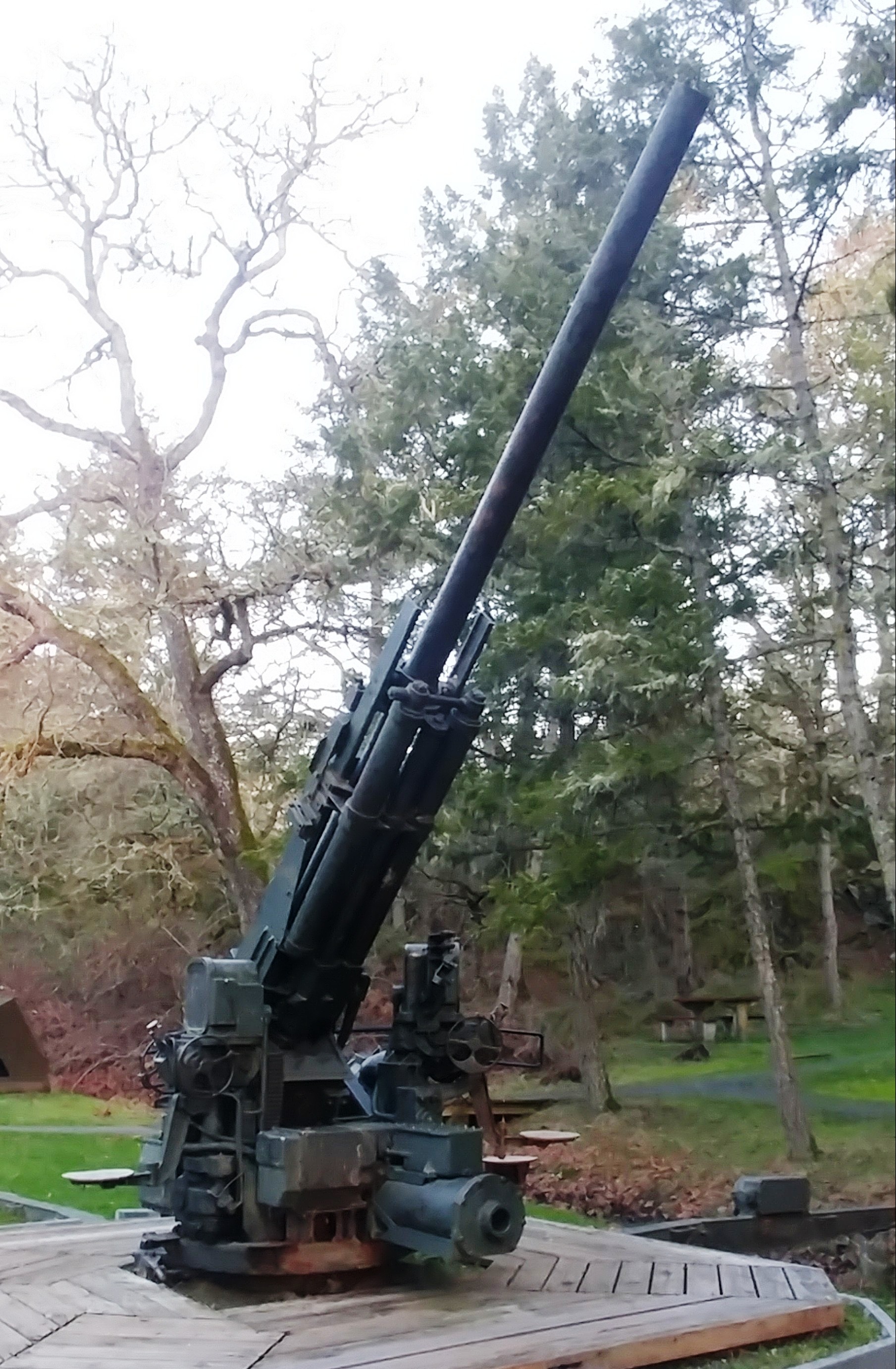 American 90-mm M1A1 Anti-Aircraft Gun, 72382 stamped on the barrel, Chevrolet, and General Motors stamped on the breech.  The left indicator regulator (M1A1) on the gun bears a plate with the serial number 19873.  This gun is on display near the parking lot.   This type of gun was used by the American army during the Second World War, but it was not adopted by the Canadian army until the early 1950s when it replaced the British 3.7 inch anti-aircraft gun.  The breech of this gun has been welded shut and the wheels used when the gun is being transported have been removed.  Fort Rodd Hill National Historic Site of Canada, Colwood, British Columbia.