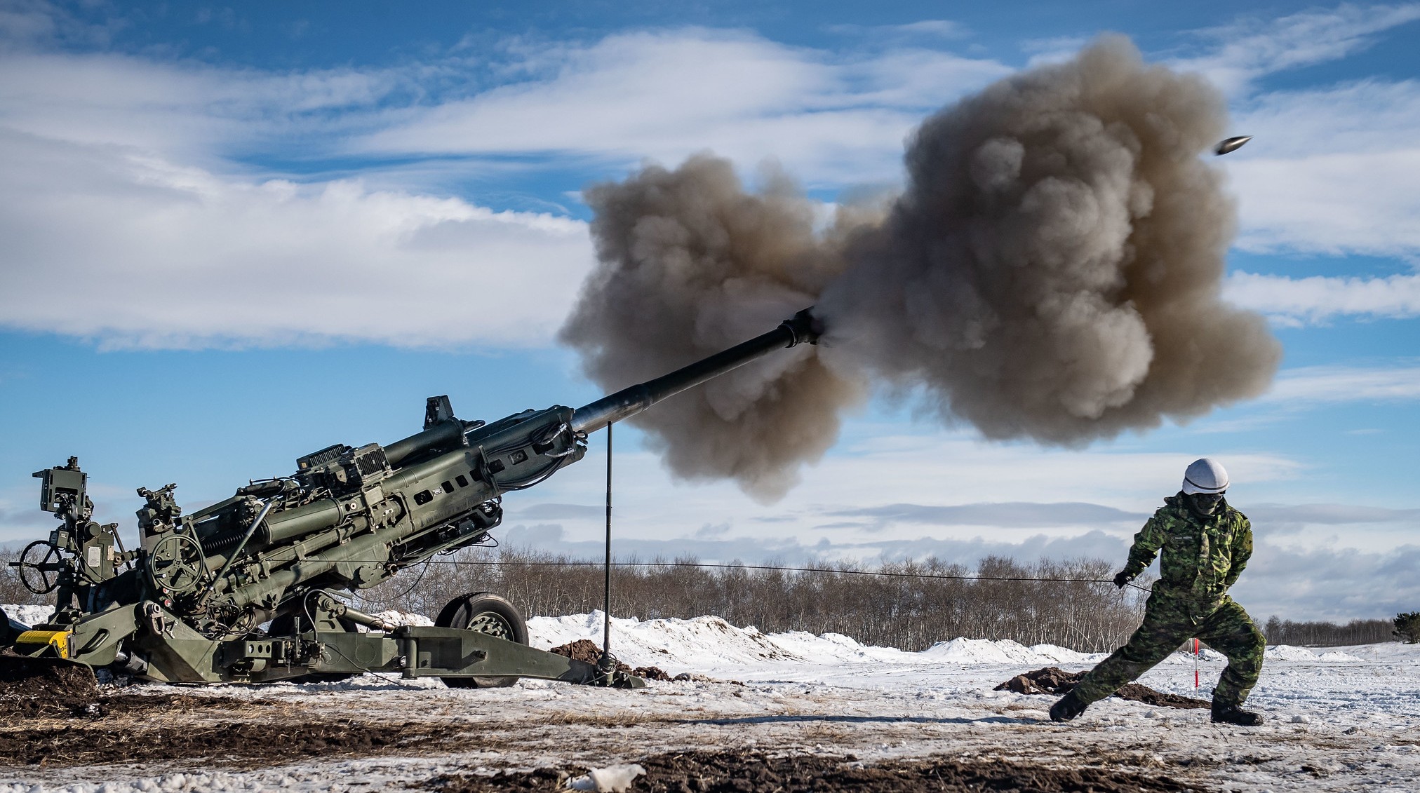 Canadian soldiers fire a 155-mm M777 Howitzer field artillery gun from a forward operating base in the Helmand Province of Afghanistan, 7 Apr 2007.