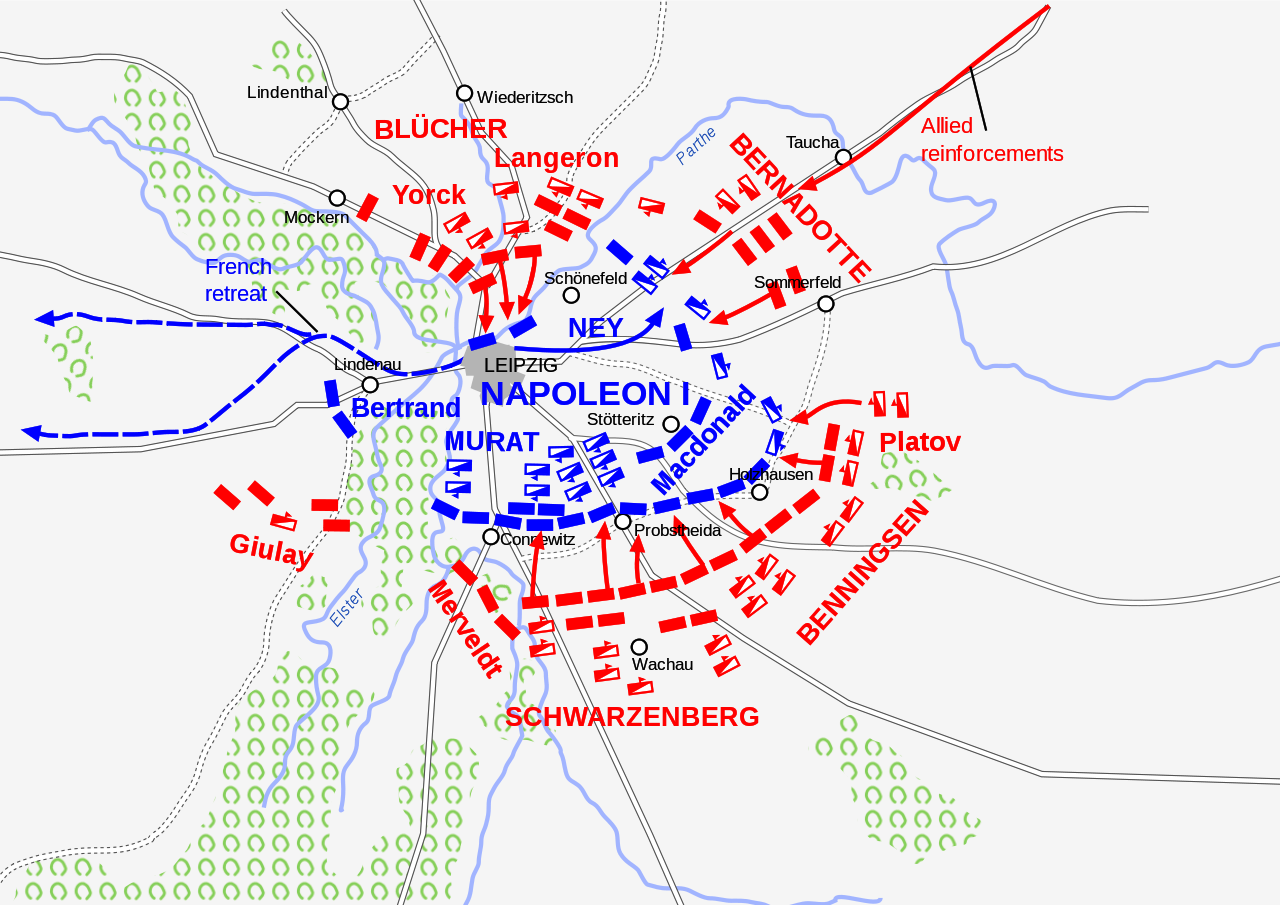The losing side did not make the same mistake when the Battle of Leipzig or Battle of the Nations was fought from 16 to 19 October 1813, at Leipzig, Saxony in what is now the unified area of former East Germany. The coalition armies of Russia, Prussia, Austria, and Sweden, led by Tsar Alexander I of Russia and Karl Philipp, Prince of Schwarzenberg, decisively defeated the French army of Napoleon I, Emperor of the French. Napoleon’s army also contained Polish and Italian troops, as well as Germans from the Confederation of the Rhine. The battle was the culmination of the 1813 German campaign and involved nearly 600,000 soldiers, making it the largest battle in Europe prior to the First World War.