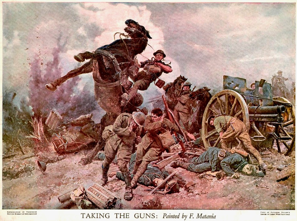 Painting of Canadians capturing a German First World War 7.7-cm Feldkanone 96 neuer Art (7.7-cm FK 96 n.A.), entitled “Taking the Guns”, ca 1918, by Forunino Matania.