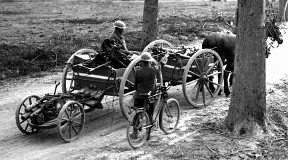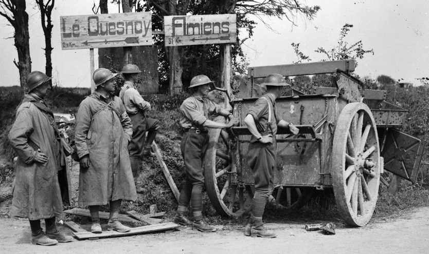Canadian and French soldiers with German ammunition wagon, Amiens, Aug 1918.