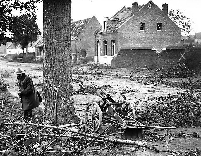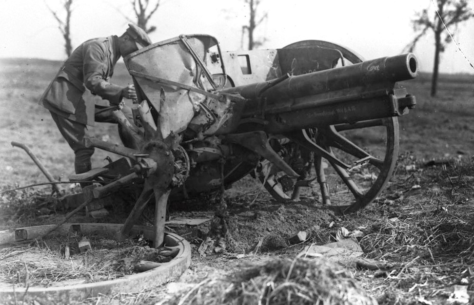 Damaged German 7.7-cm Feldkanone 96 n.A. near Buissy. Captured during the advance East of Arras, September, 1918.