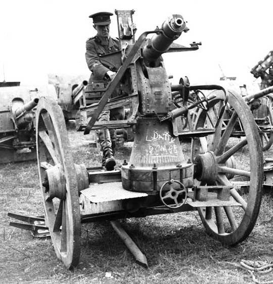 Captured German 3.7-cm Maxim Flak M14 Anti-aircraft Gun, Amiens, Aug 1918. This was a version of the 37-mm Maxim-Nordenfelt AA gun produced in Germany for both the Navy and Army.