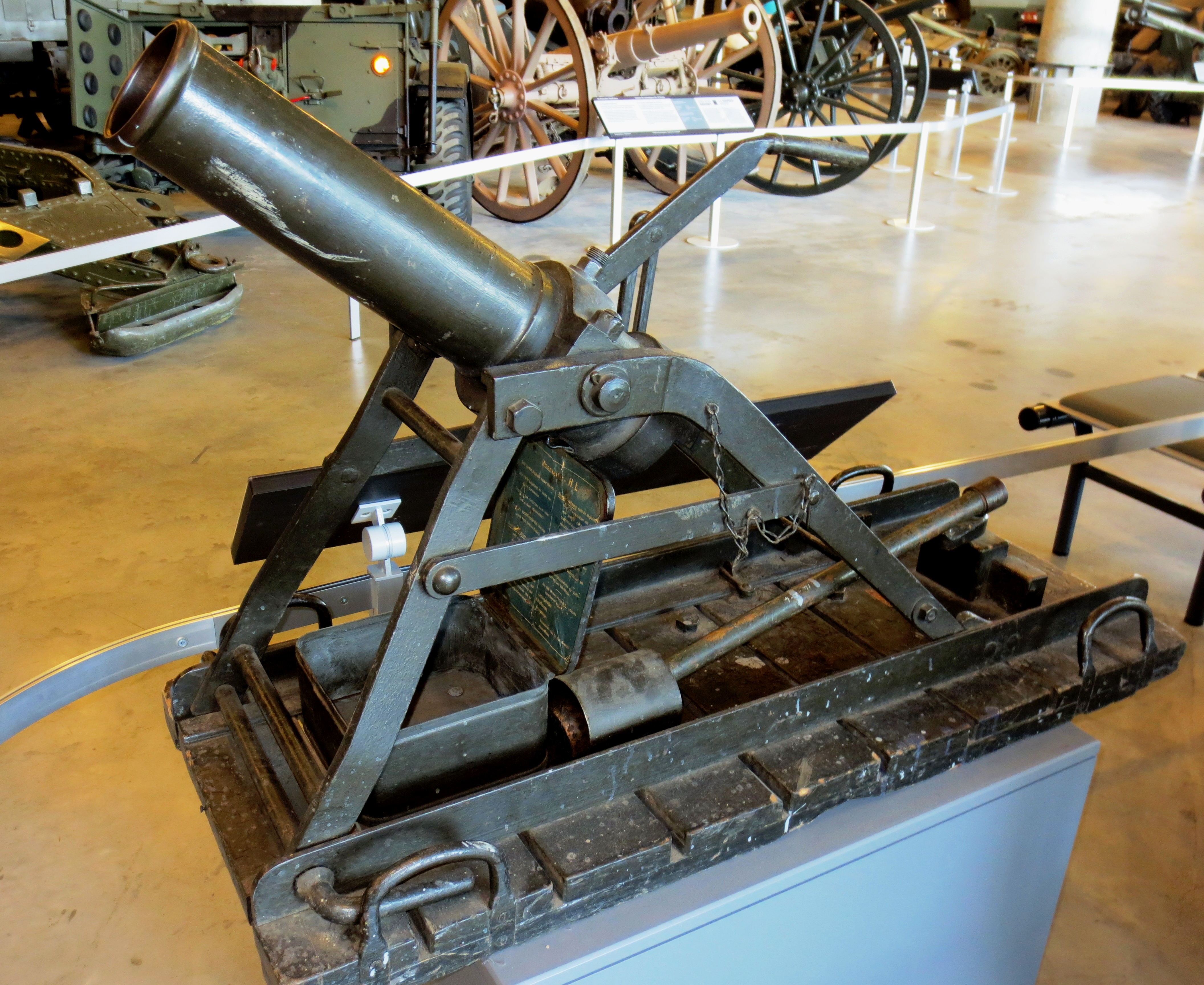 The 9.15 cm leichtes Minenwerfer System Lanz (Trench mortar) was a light mortar used by Germany and Austria-Hungary in the First World War. It was a smoothbore, breech-loading design that used smokeless propellant. It was chosen by the Austrians as an interim replacement for their 9 cm Minenwerfer M 14, pending development of a superior domestic design, which eventually turned out to be the 9 cm Minenwerfer M 17. The older Austrian design had a prominent firing signature, a less effective bomb and shorter range than the Lanz. Over 500 were ordered with deliveries beginning in April 1917.