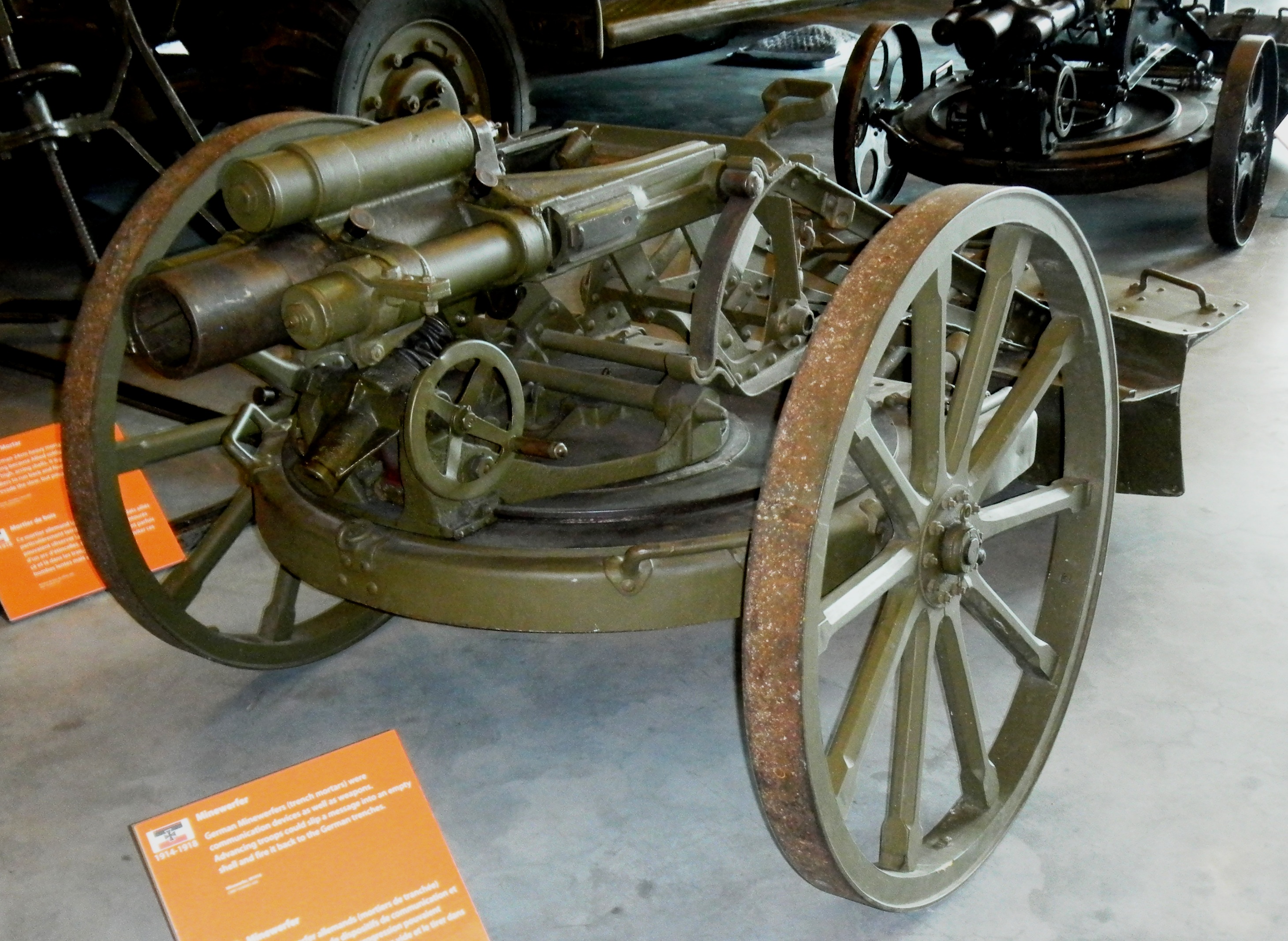 German First World War 7.58-cm leichtes Minenwerfer neuer Art (7.58-cm leMW), (Serial Nr. 5160), AEG M1916, rifled, stamped 2108625, jk, 2660, 5169, mounted on wooden carriage wheels. Captured by the 20th Battalion at the Cité St. Emile, North of Lens, France, on 15 August 1917. This leMW n.A. is marked “captured and claimed by the 3rd Can TM” on the rotator/base plate (most likely the 3rd Canadian Trench Mortar Battery). Canadian War Museum, Ottawa.