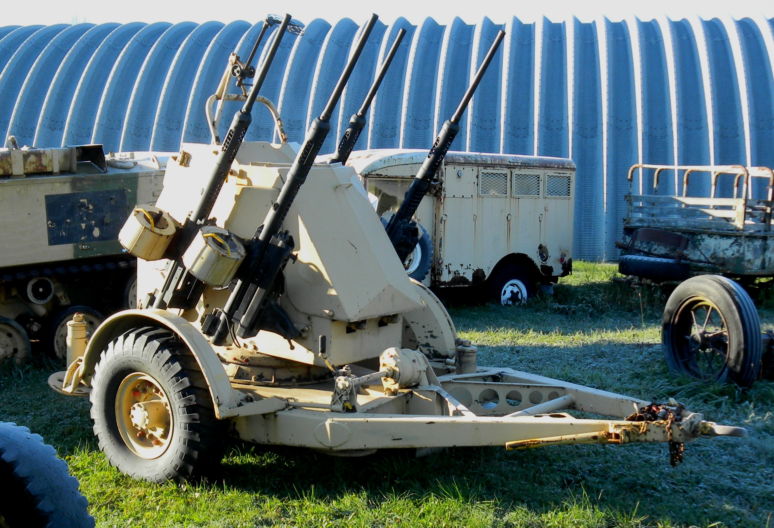 It was used on a wheeled mounting that could be towed behind a jeep. Various double, triple and quadruple mounts were developed. John Inglis Limited of Toronto, Ontario, produced many thousands of guns and some 500 quadruple mountings that saw limited service at the end of the war. These multiple mounts were both trailered and truck-mounted.