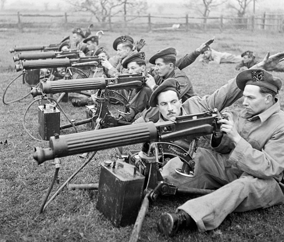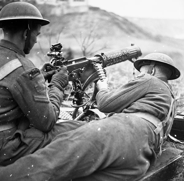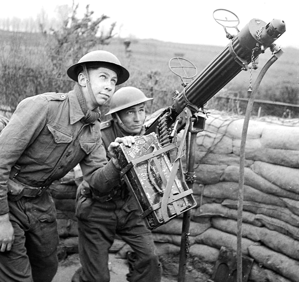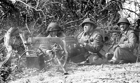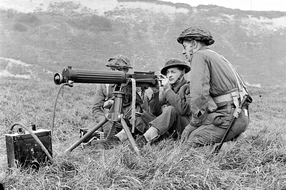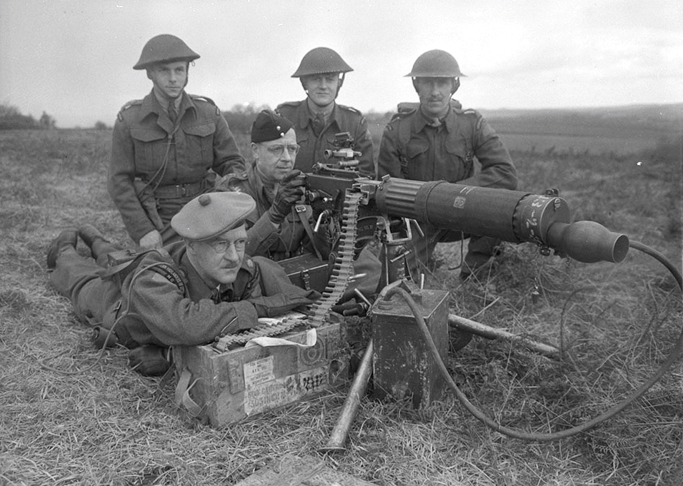 Princess Patricia’s Canadian Light Infantry (P.P.C.L.I.) firing a Vickers machine gun during a training exercise, Eastbourne, England, 3 December 1942.