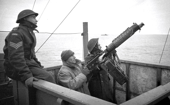 A Canadian machine gun crew aboard HMT Empress of Canada, which was taking part in Operation GAUNTLET, the Spitsbergen raid, en route to Spitsbergen, ca. 19-24 August 1941.