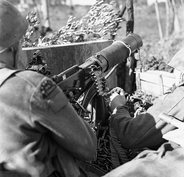 Cameron Highlanders of Ottawa laying down fire with a Vickers machine gun during a training exercise, England, 14 April 1944.