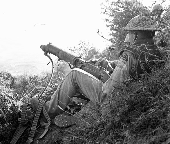 Saskatoon Light Infantry (M.G.) firing a Vickers machine gun at targets in Potenza, Italy, 20 September 1943.
