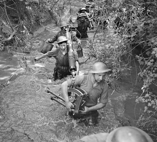 Canadian infantry unit relocating a Vickers machine gun during a training exercise, England, June-July 1942.