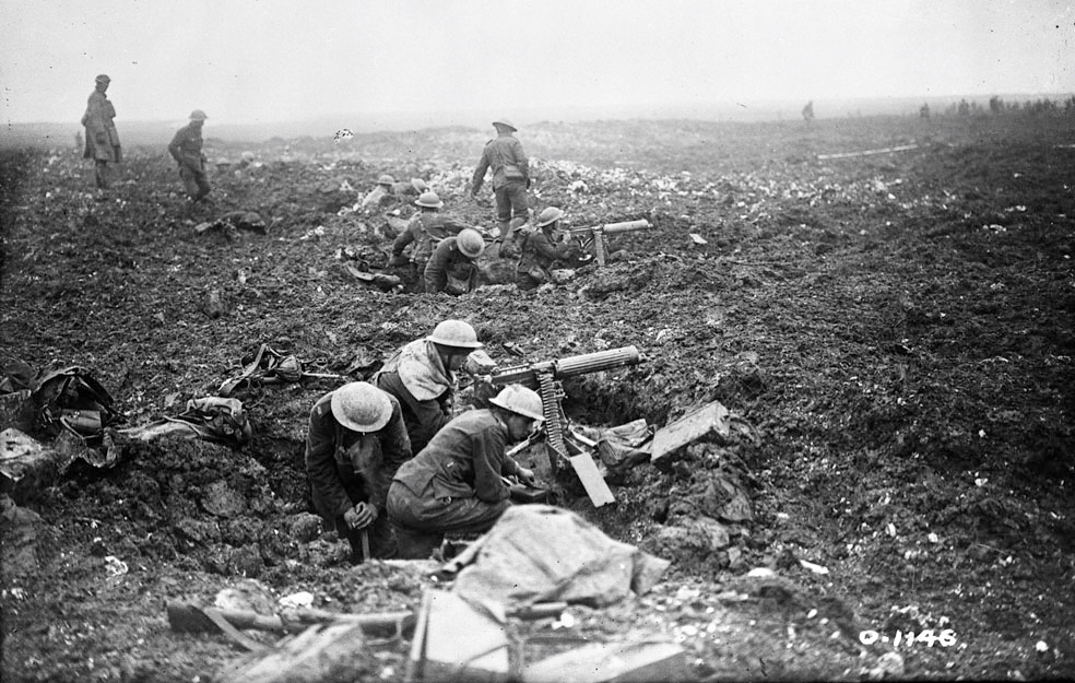Canadian machine gunners dig themselves in, in shell holes on Vimy Ridge, April 1917.