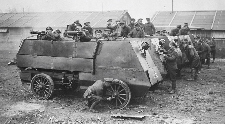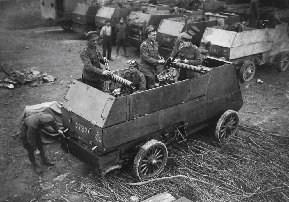 Armoured cars of the Canadian Motor Machine Gun Brigade armed with Vickers machine guns, April, 1918.