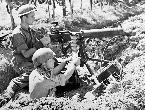 Saskatoon Light Infantry (M.G.) laying down harassing fire with a Vickers machine gun near Ortona, Italy, 7 January 1944.