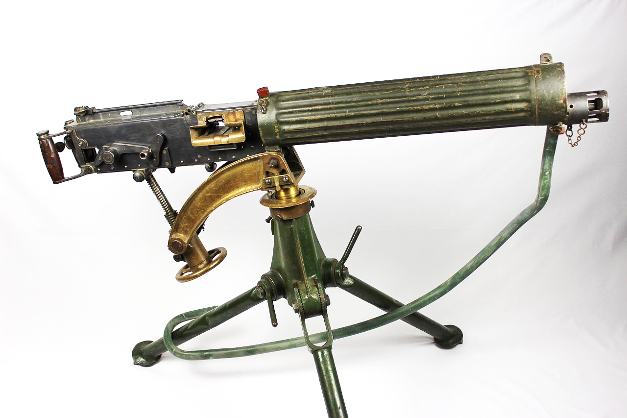.303-inch Vickers machine gun with tripod mount and associated ammunition belt, ammunition box plus petrol can (as a condenser can) with hose. The Vickers Gun was the standard British machine gun from 1912. It was heavy and mounted on a tripod, requiring a team of six men to transport it to and operate it on the battlefield. Although difficult to use on advancing troops, machine guns were used to deadly effect from defensive positions.