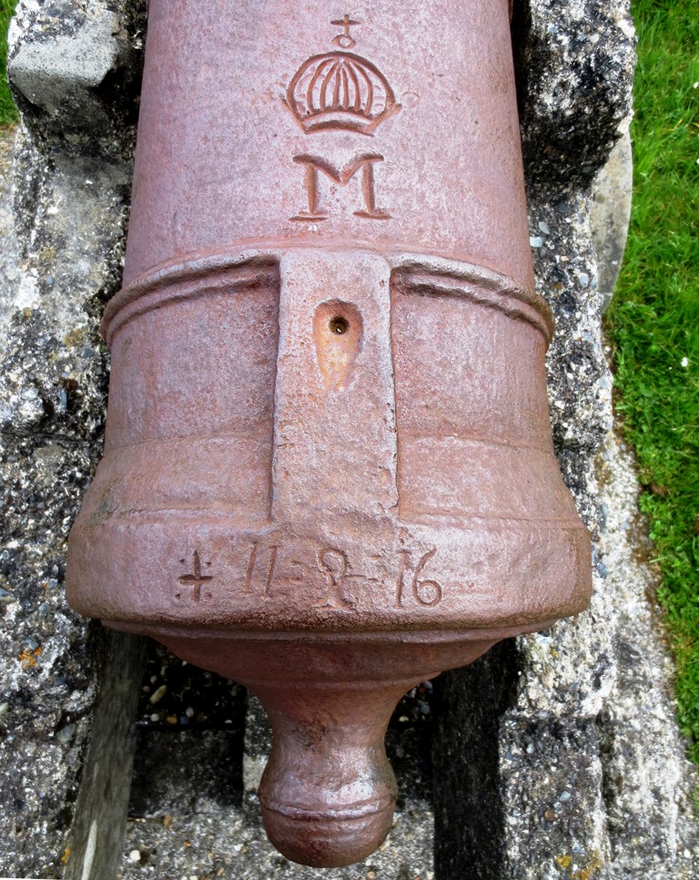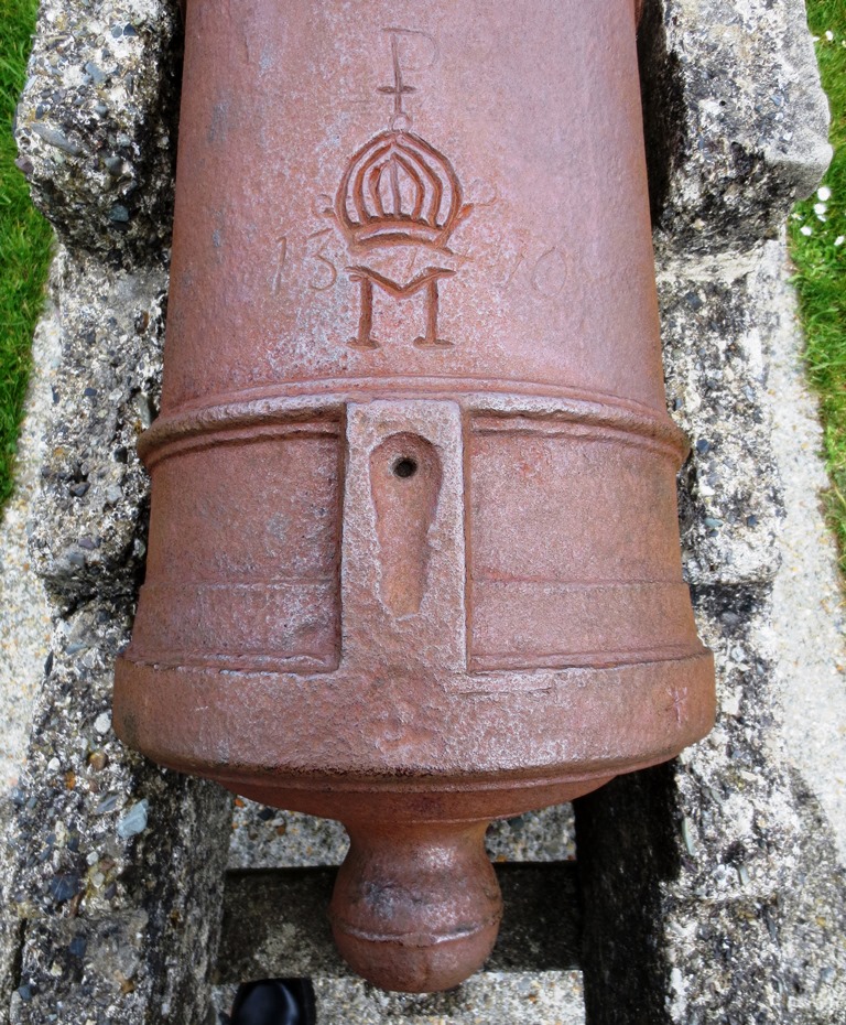 Cast Iron 6-pounder Smoothbore Muzzleloading Gun, weight 13-1-10 (1,494 lbs), (I) on both left and right trunnions, maker unknown, mitre over crowned M above the touchhole, 176-cm long.  No. 3 of 4 forward of the castle facing the water.
