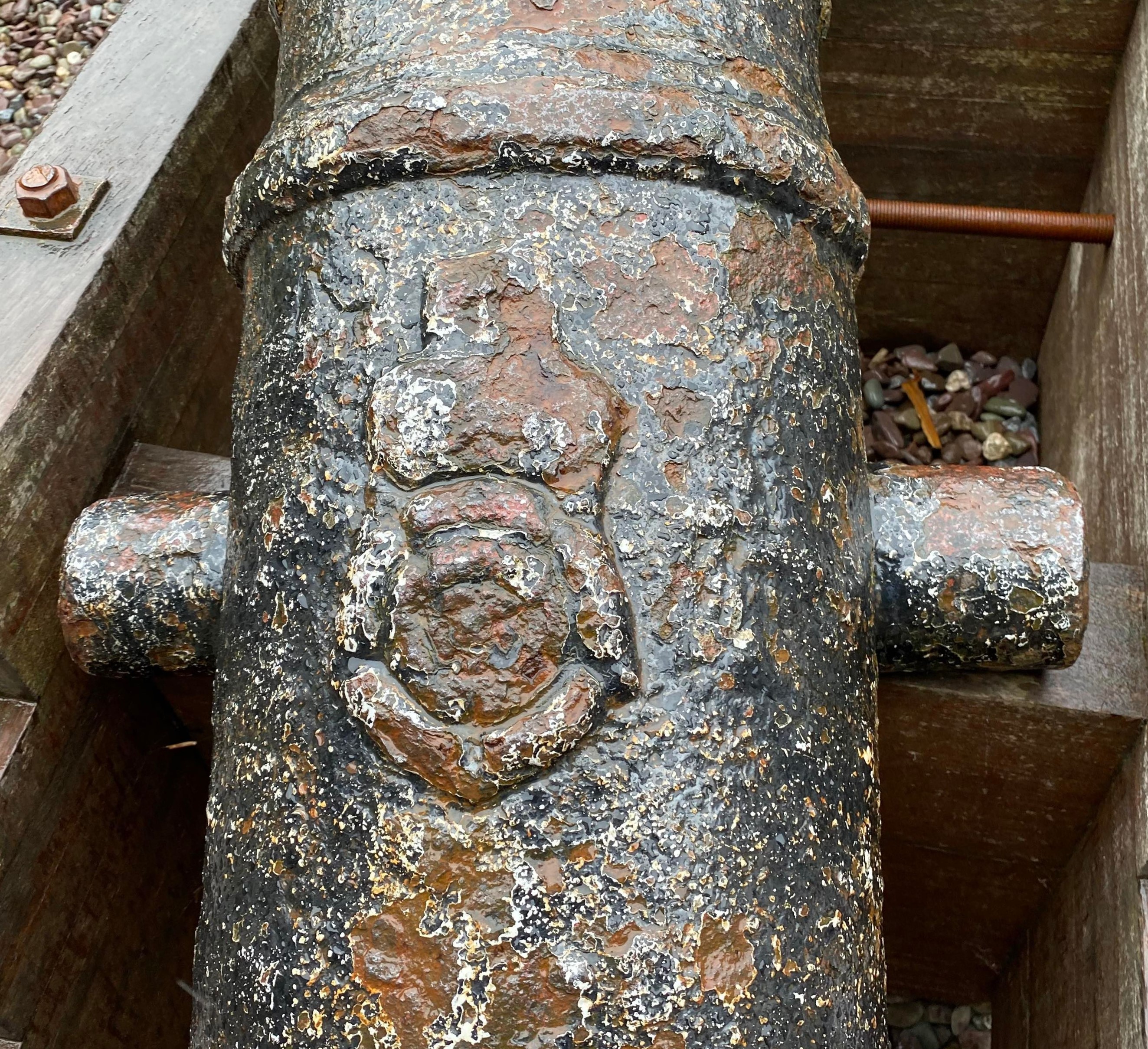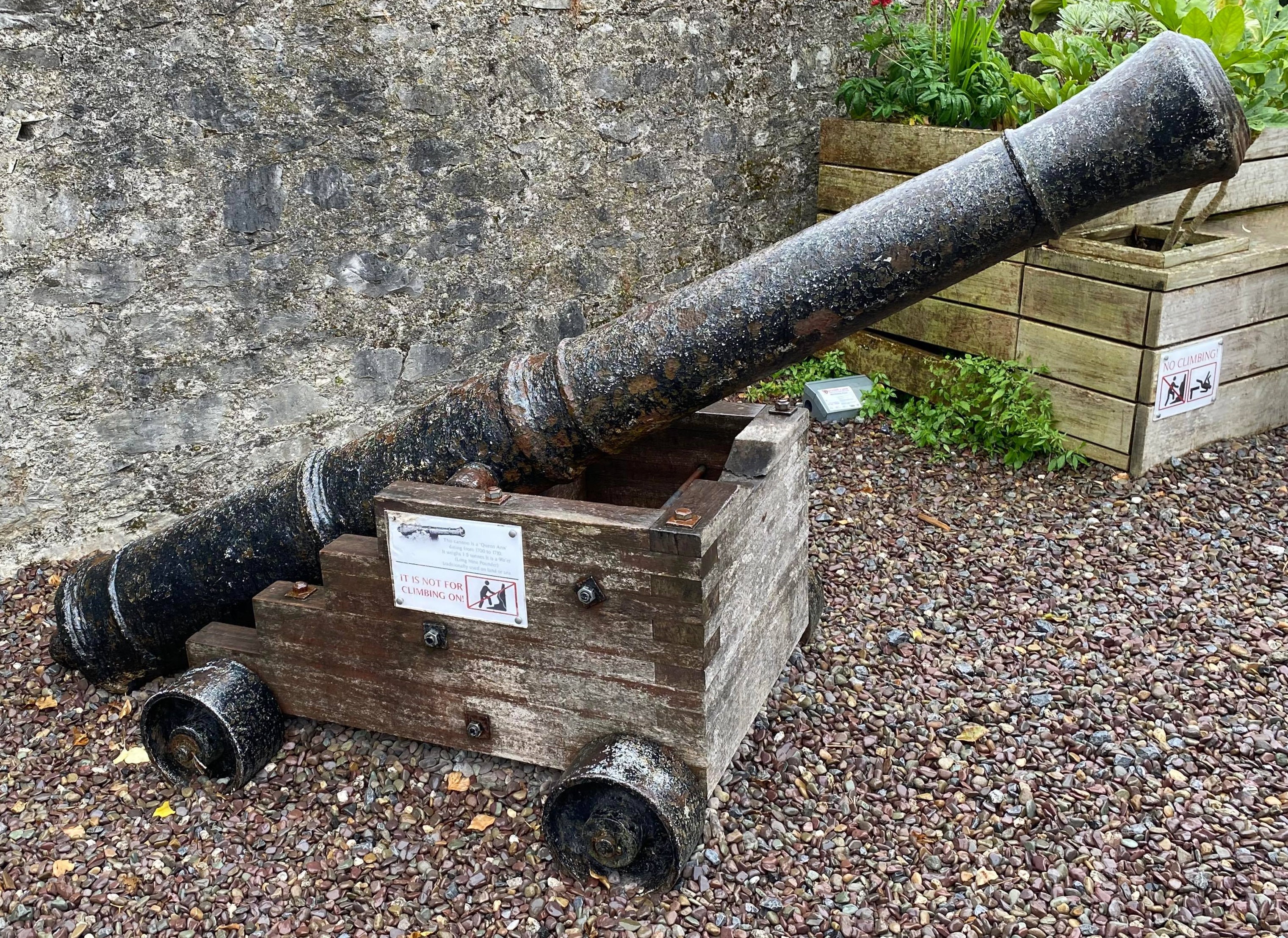 Cast Iron 6-pounder Smoothbore Muzzleloading Gun, weight 11-2-16 (1,304 lbs) above the cascabel on the breech, (Serial No. 539 TBC, CARRON, Year corroded) on the left trunnion, (6-P) on the right trunnion, Falkirk, mitre over crowned M above the touchhole, 186-cm long.  No. 2 of 4 forward of the castle facing the water.