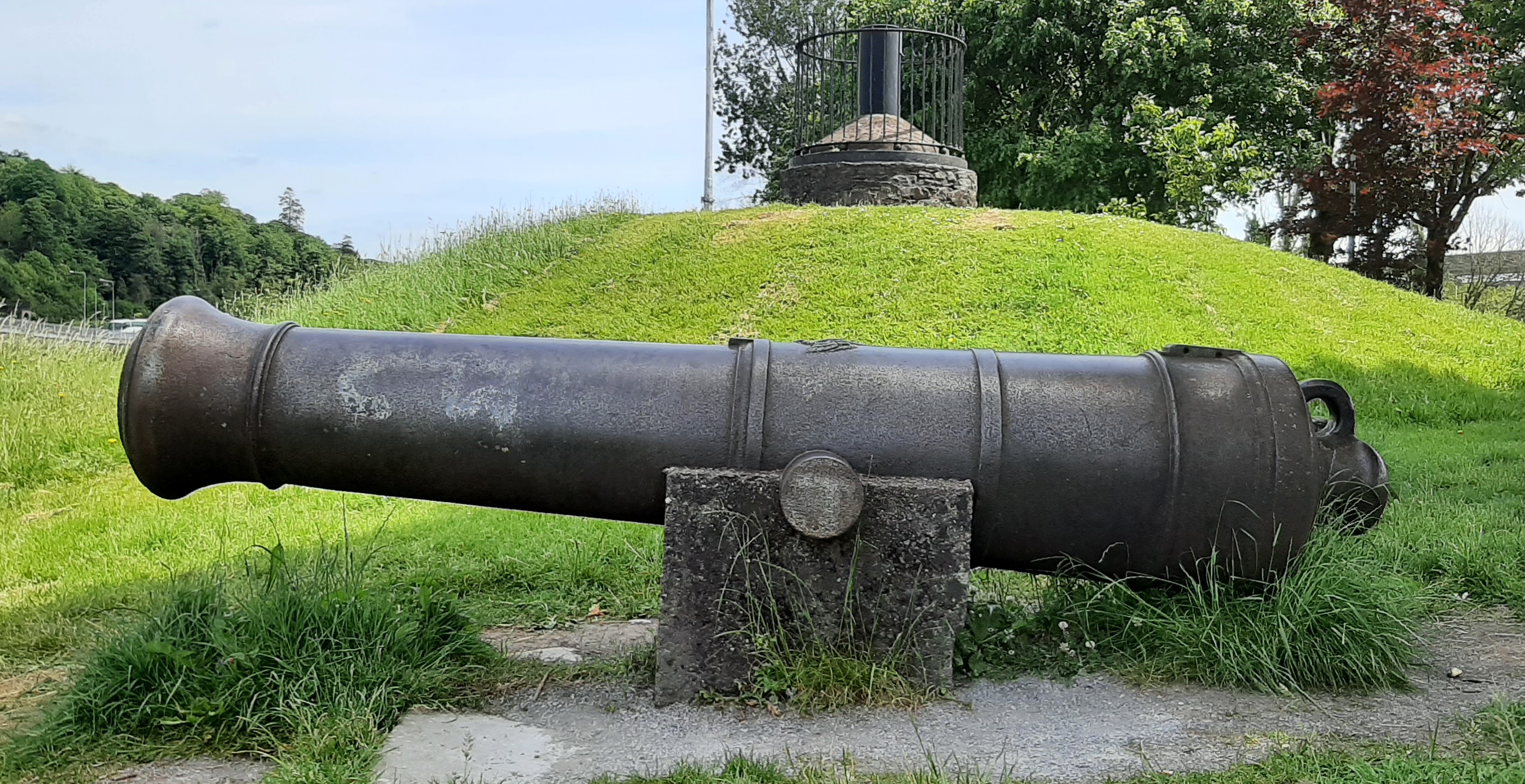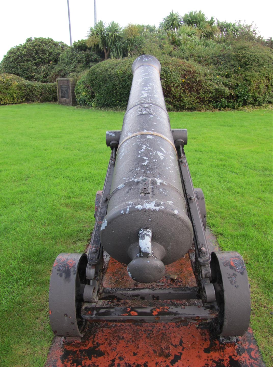 One of a pair of Russian cast iron Blomefield pattern smoothbore muzzleloading guns that originally flanked the mound at the Marina (possibly 24-pounders).  Cork was the first Irish city to ask for Crimean war trophies.  A pair arrived in 1857.  This gun stands next to the former Captain Hanson Flagstaff mound, and was captured during the Crimean War (1853-1856) in the British Siege of Sebastopol on the Black Sea in the late 1850s.  Both guns were originally installed at the junction of the South Mall and the Grand Parade, to embellish the equestrian statue of King George II.  When the statue was destroyed in 1862, the guns were moved to The Marina.  The mound was originally flanked by both of these guns mounted on wooden carriages.  The second gun is now missing as is the wooden carriage of the remaining gun.