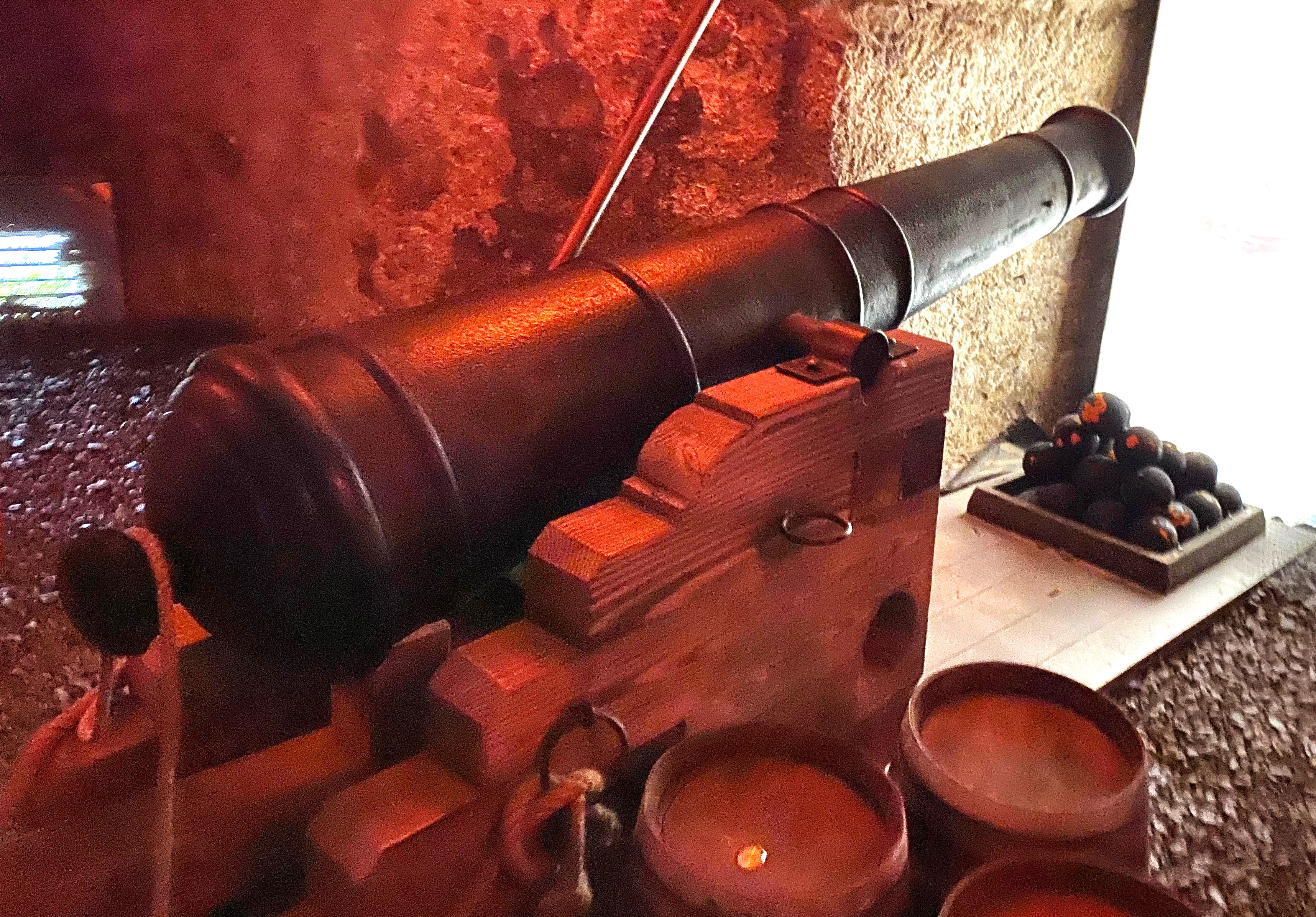 Cast iron smoothbore muzzleloading gun, mounted on a wood stand inside Black Rock Castle.