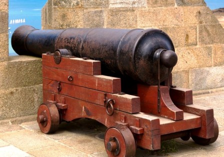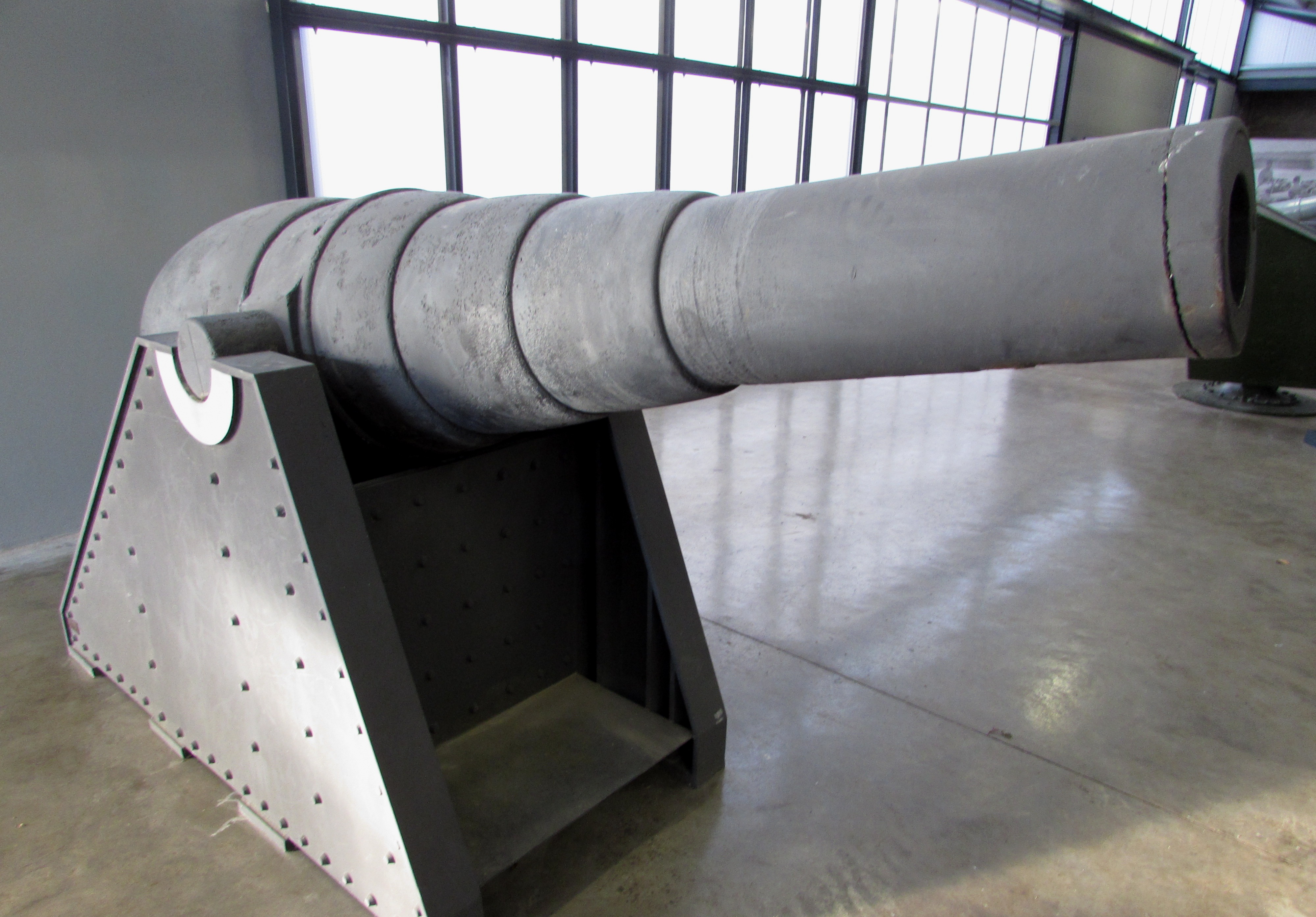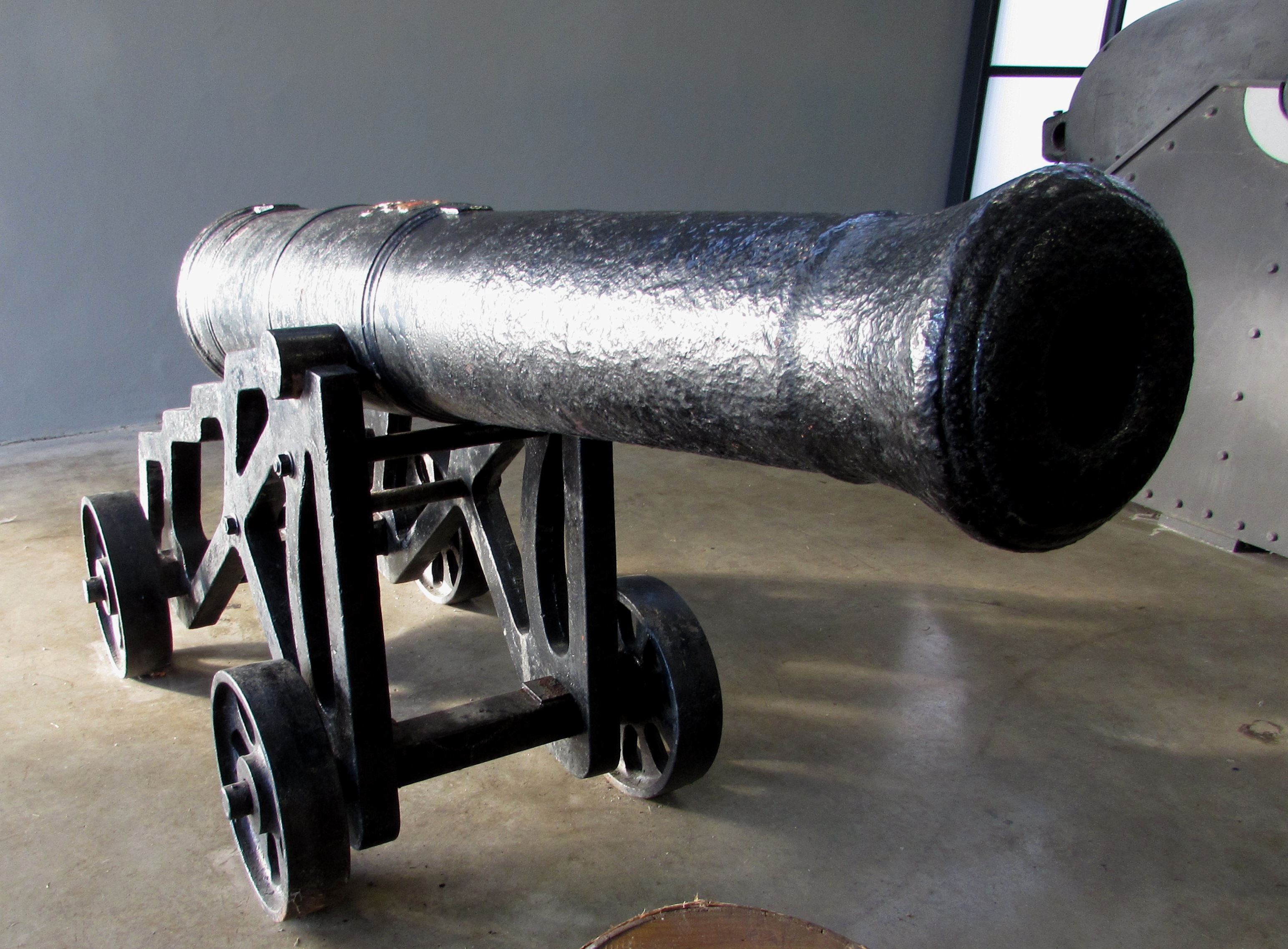 Cast Iron possible 24-pounder 50-cwt Smoothbore Muzzleloading Gun, mounted on a Naval gun carriage on the fortress wall.