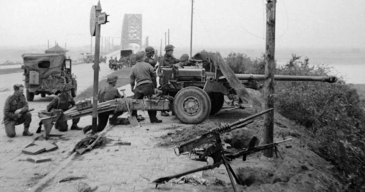 Ordnance QF 17-pounder anti-tank gun of the 21st Anti-Tank Regiment, Guards Armoured Division, guards the approaches to Nijmegen Bridge, the Netherlands, 21 September 1944.