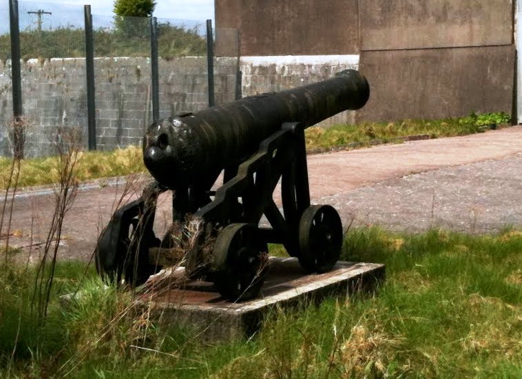 Cast Iron possible 6-pounder Smoothbore Muzzleloading Gun mounted on an iron gun stand overlooking the entrance to Fort Mitchel with two Blomefield Cast Iron possible 24-pounder 50-cwt Smoothbore Muzzleloading Guns, mounted on an iron garrison gun carriage, No. 1 and No. 2 of 2 guarding the entrance to Fort Mitchel.
