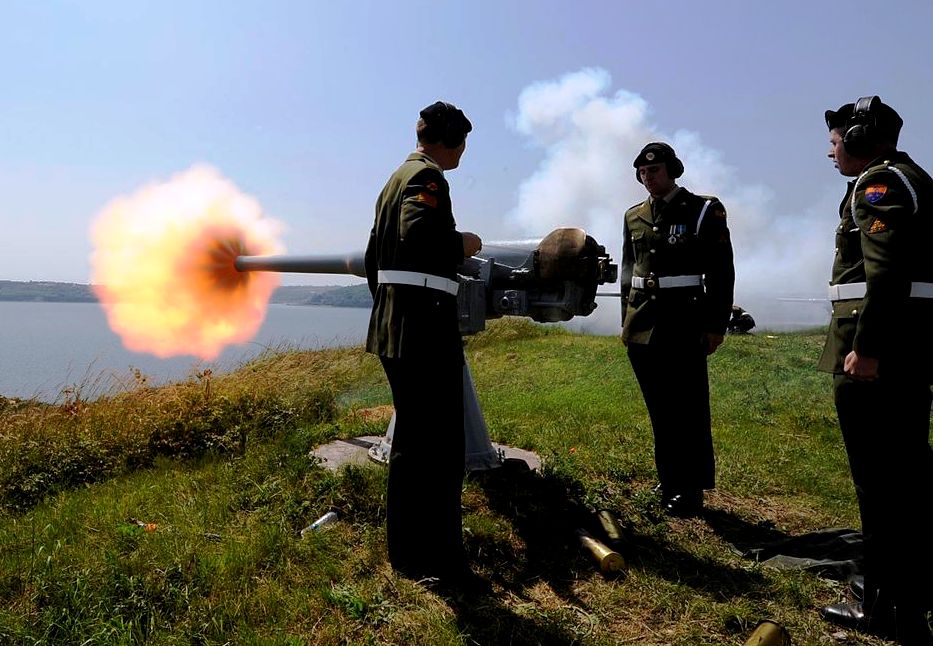 1 Artillery Regiment fire as part of the 21 Gun Salute from Spike Island to mark the 75th Anniversary of the handover of the Treaty Ports.