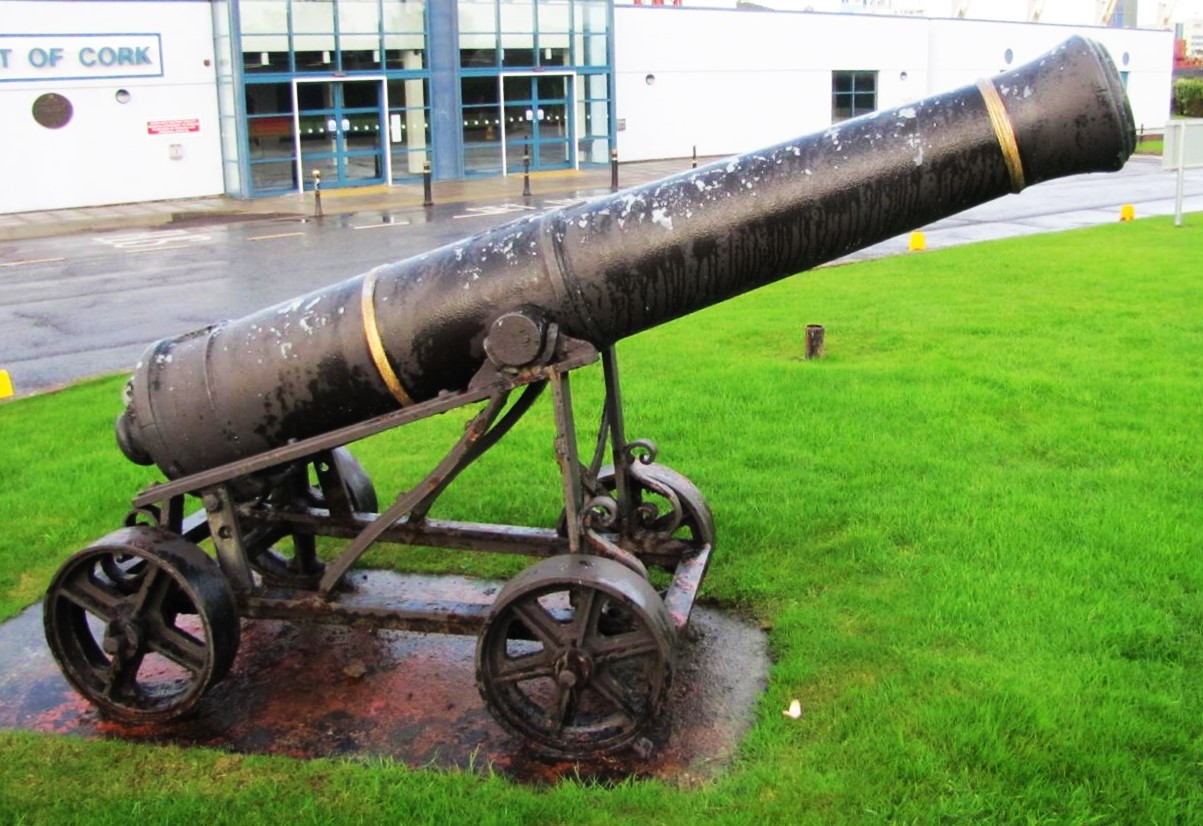 Blomefield SBML Cannon located in front of the Port of Cork Ferry Terminal in Ringaskiddy, County Cork, Ireland.