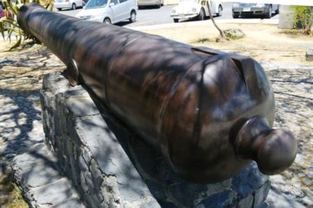 Pistola de carga de cañón liso de 9 libras de hierro fundido, n. ° 5 de 6. Diámetro del agujero de 10 cm (4 pulgadas), longitud 217 cm (85,4 pulgadas), 7,12 pies. Los muñones han sido disparados y no hay cascabel en la parte trasera. El arma está montada sobre una base de piedra. Esta arma se llama El Jocoso (el Jocular).