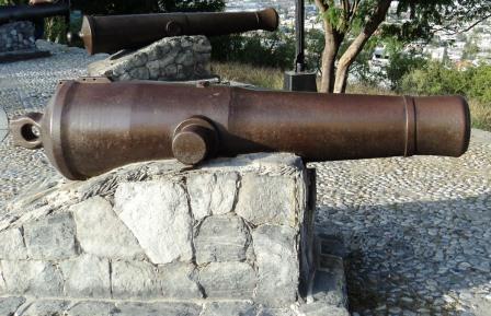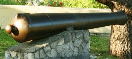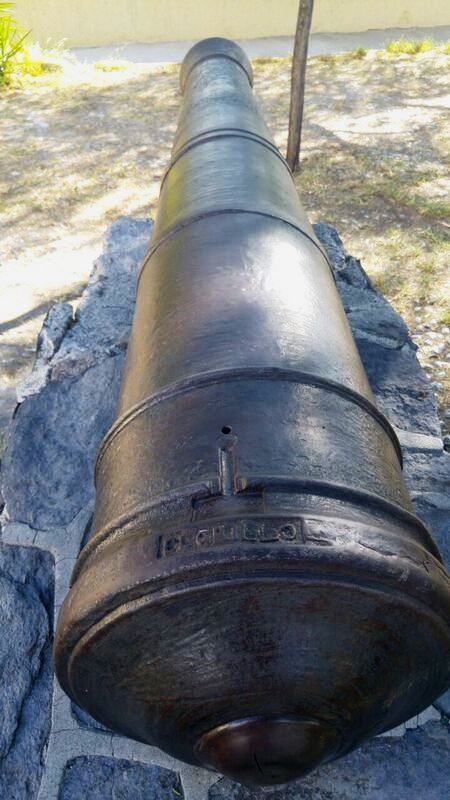 Pistola de carga de boca lisa de hierro fundido, n. ° 3 de 6. Marcada con una corona sobre la letra P en el cañón. La longitud de la pistola desde el anillo de cierre hasta el hocico es de 291 cm con una longitud total de 322 cm. El agujero tiene 15,2 cm de diámetro. Los muñones han sido cortados. El arma está montada sobre una base de piedra.