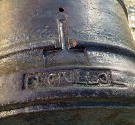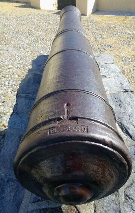 Cast Iron 9-pounder Smoothbore Muzzleloading Gun, No. 6 of 6. The gun is mounted on a stone base. This gun is named El Grillo (the cricket).
