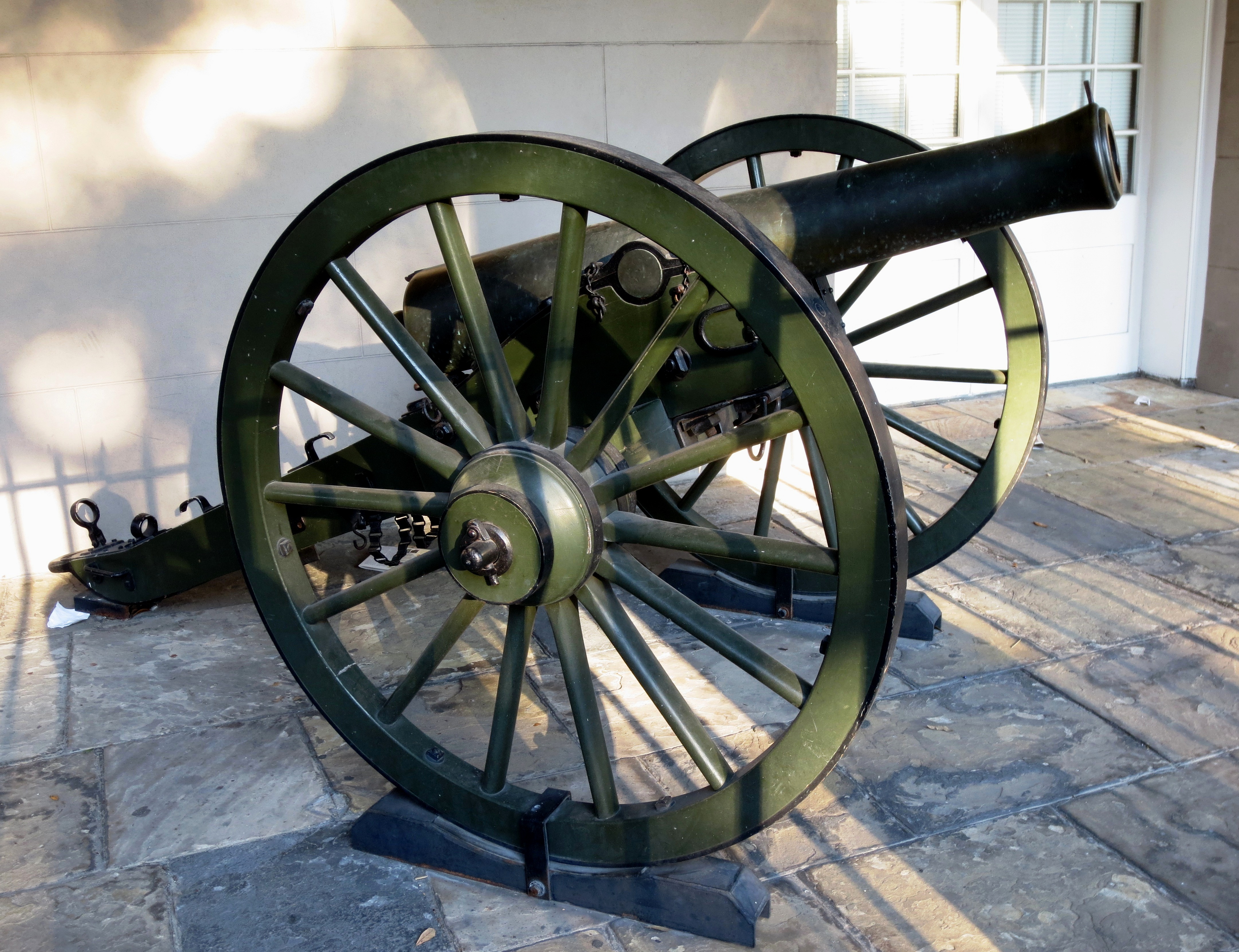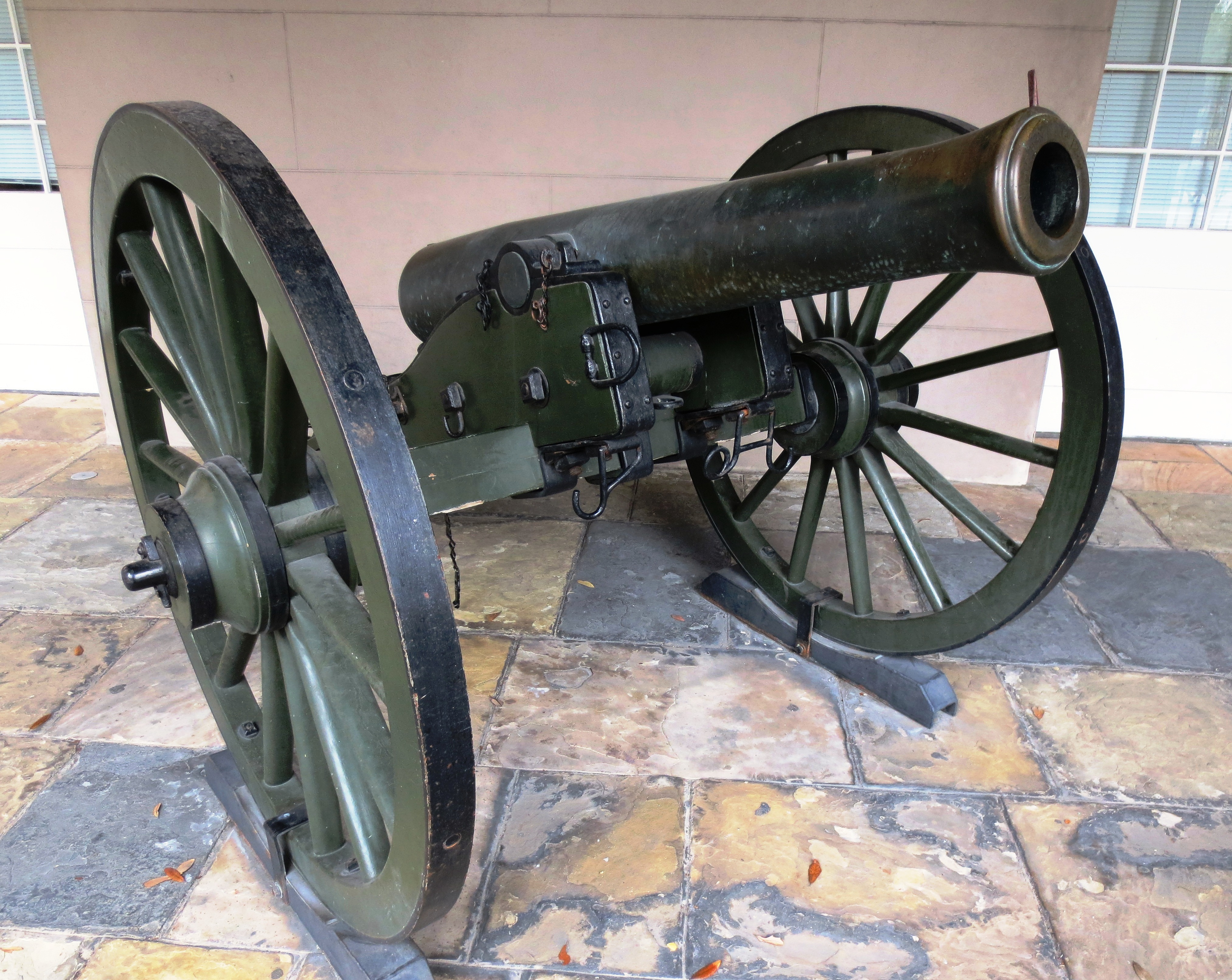 Civil War Gun Serial No. 307, mounted on a wheeled wooden gun carriage, guarding the front of the Louisiana State Museum.