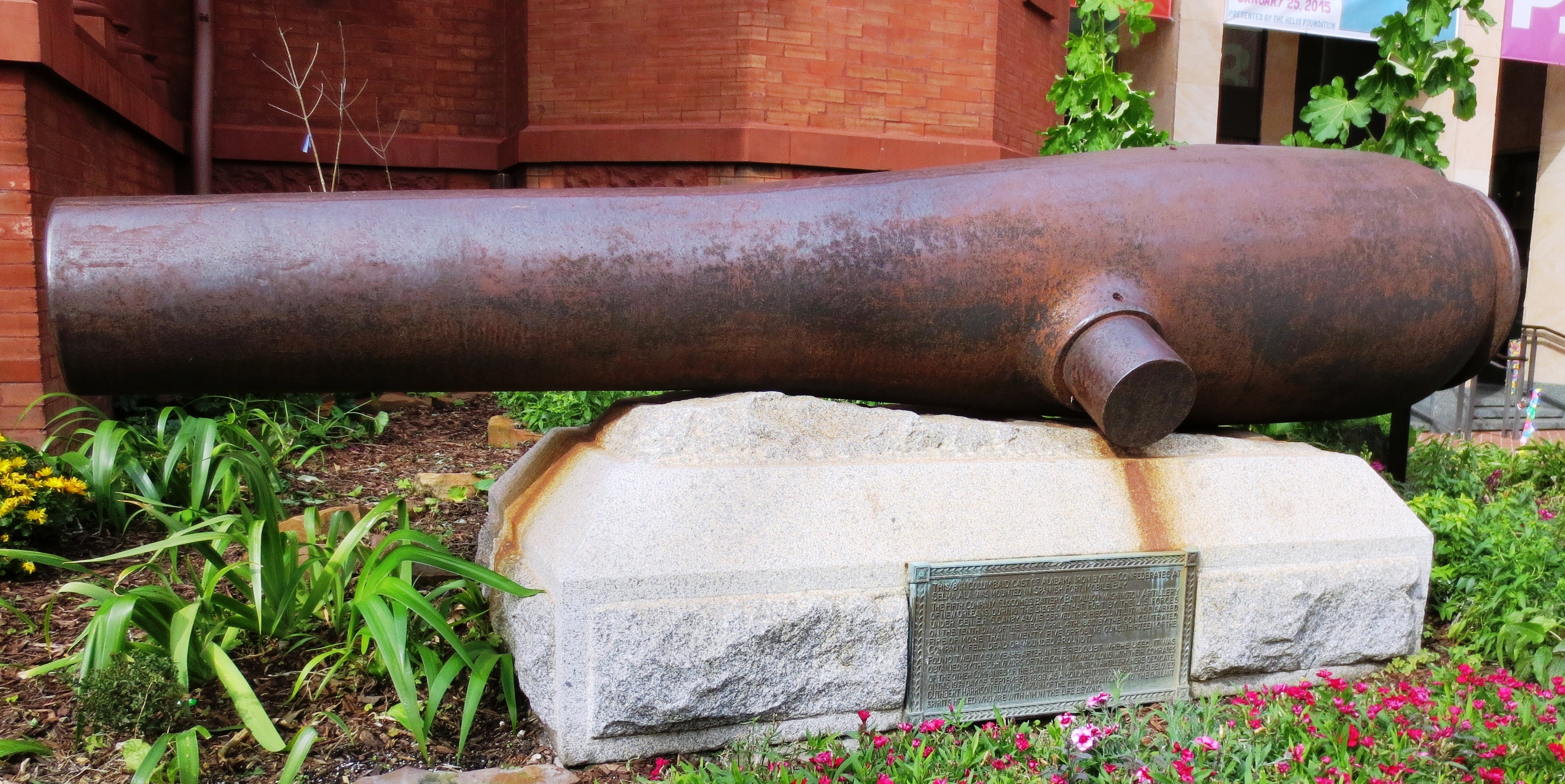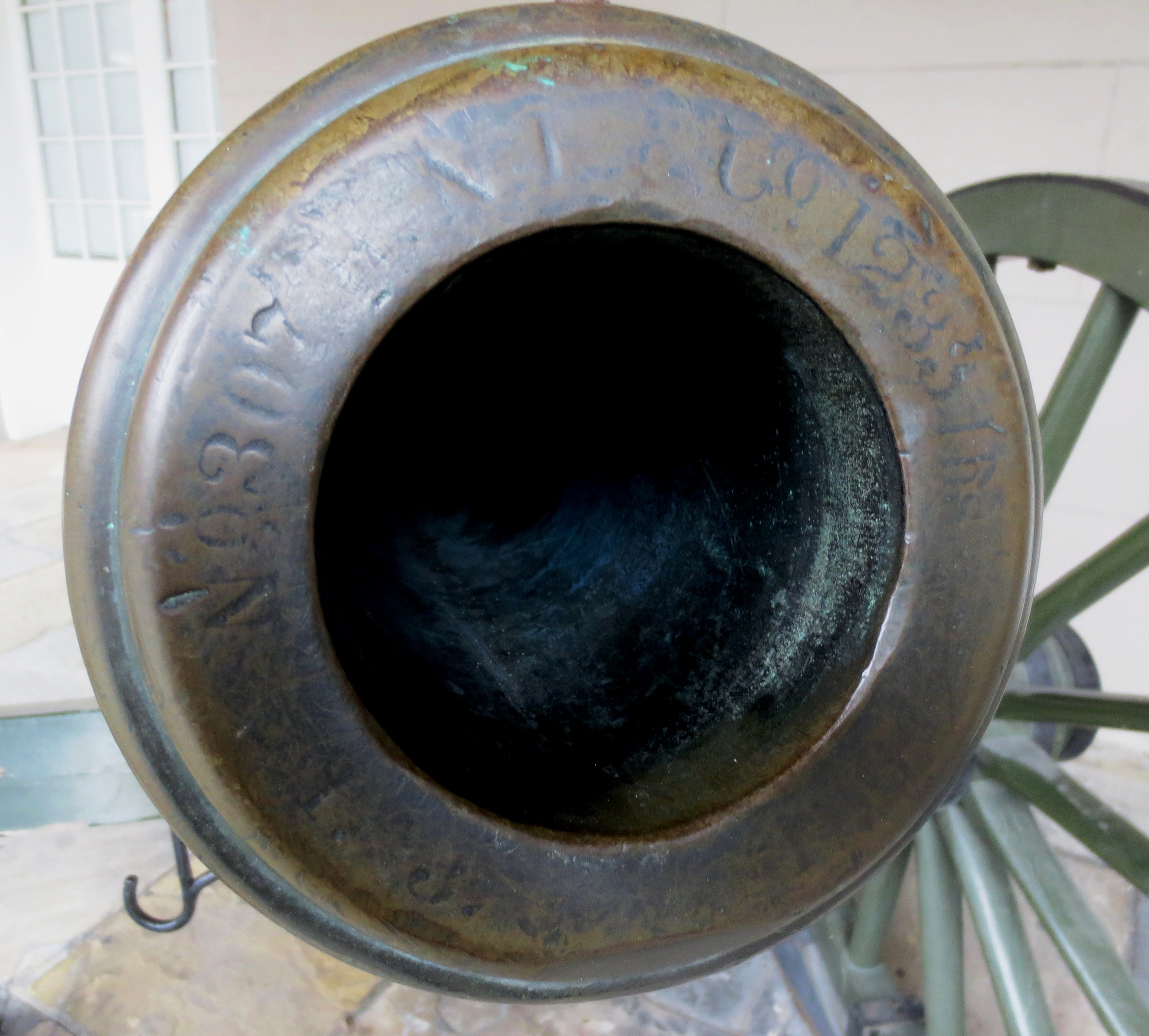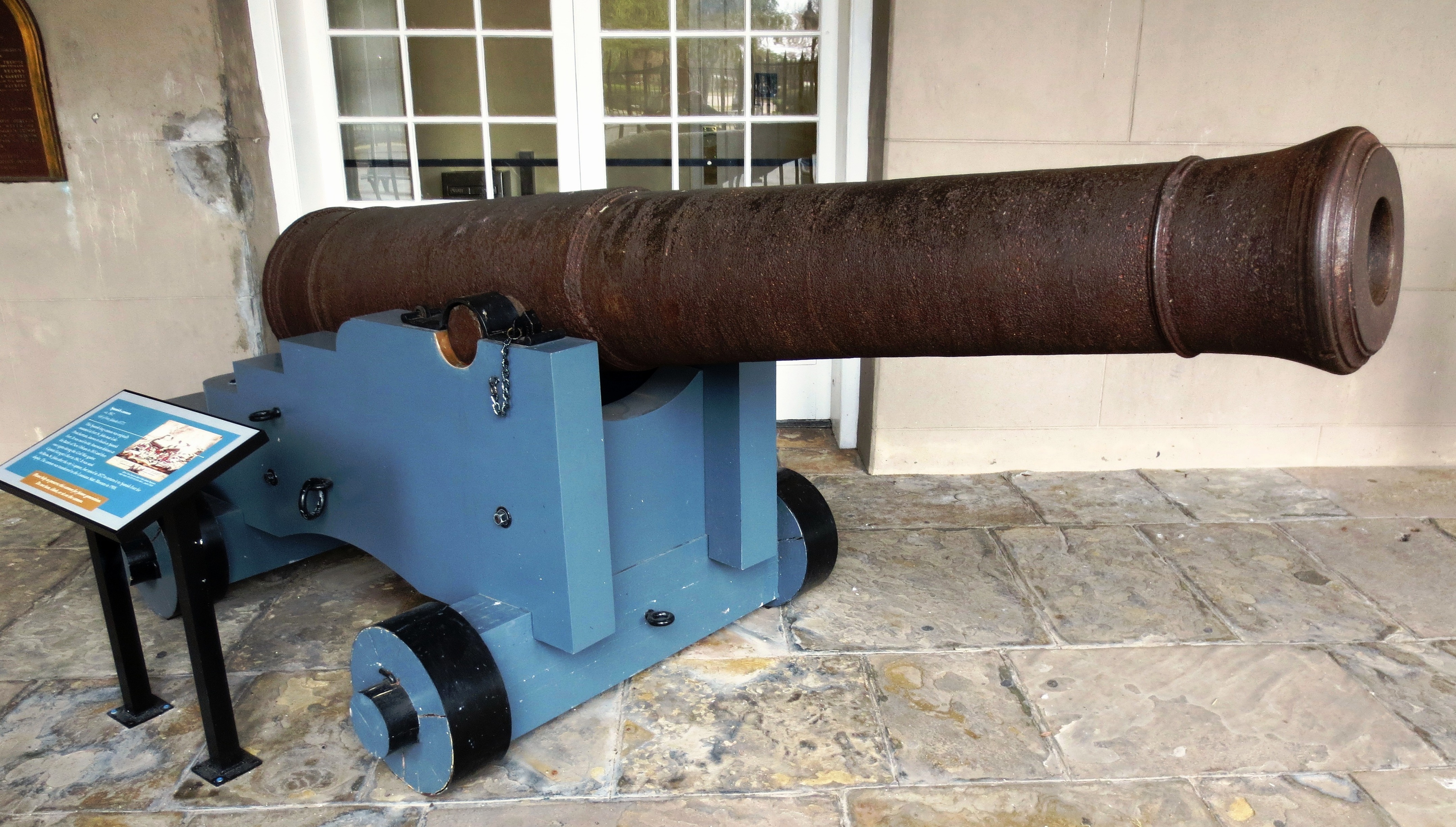 Spanish SBML Gun, weight 51-2-21 (5, 789 lbs), Serial No. 19 on trunnions, mounted on a Naval carriage, guarding the front of the Louisiana State Museum.