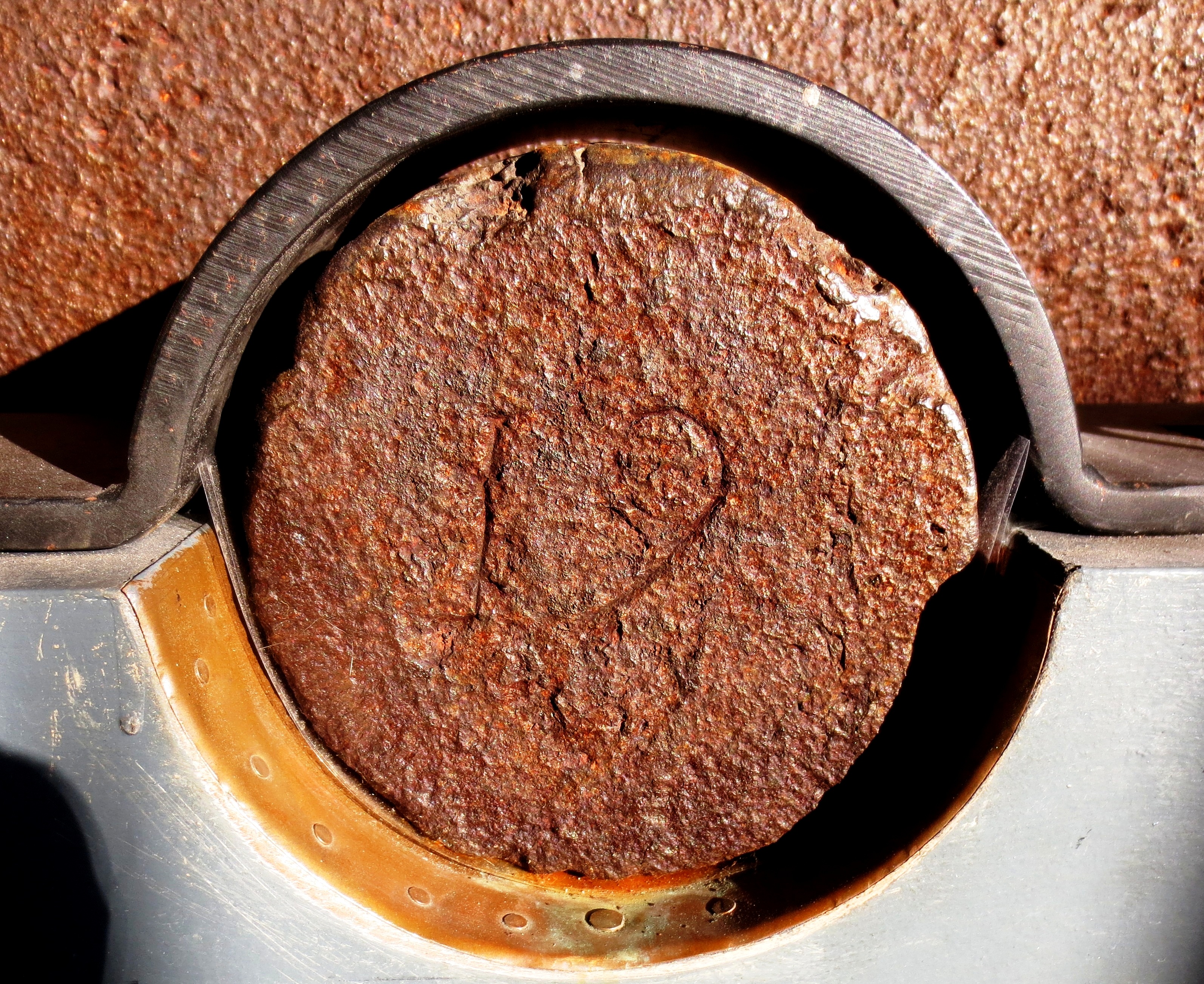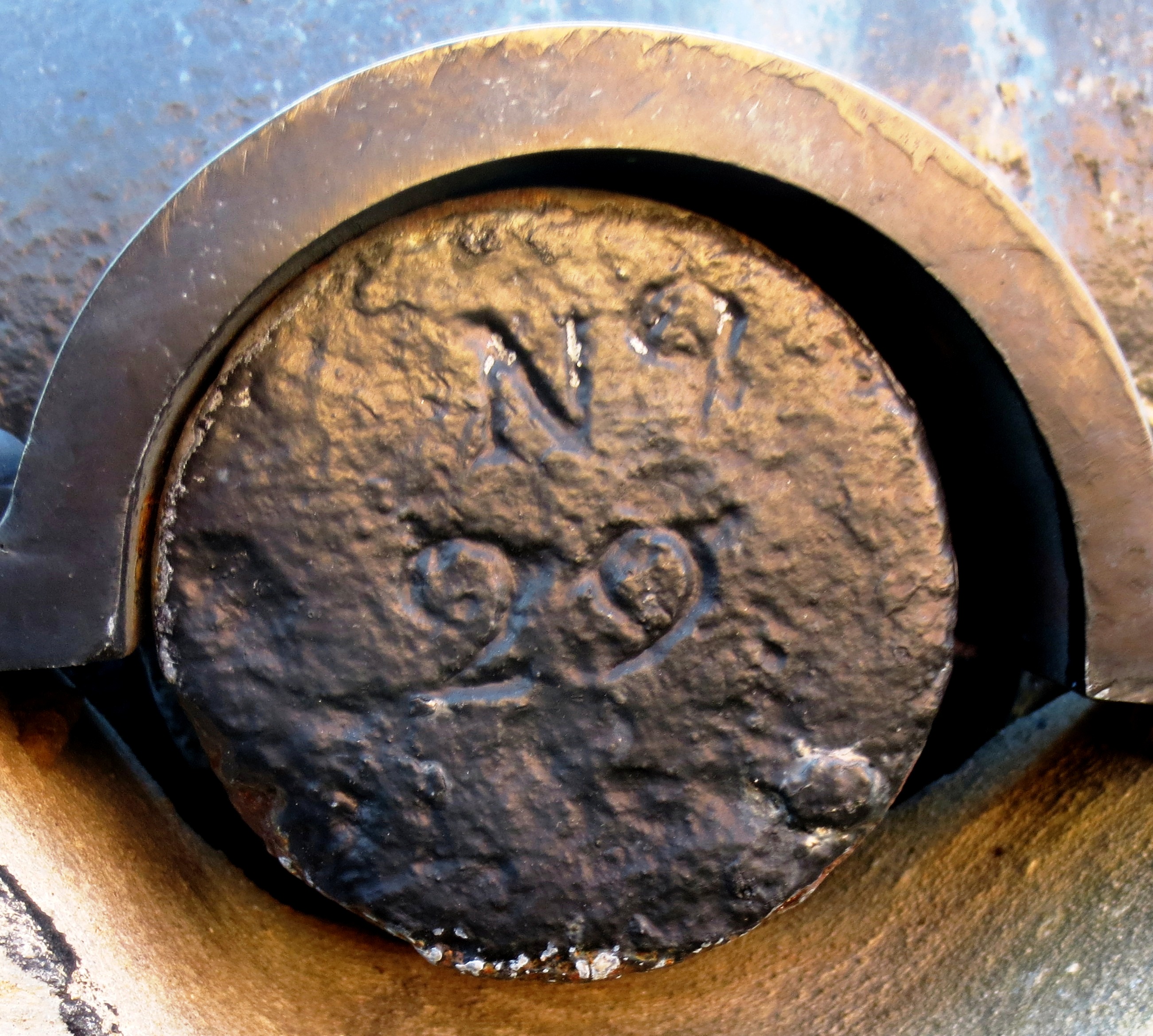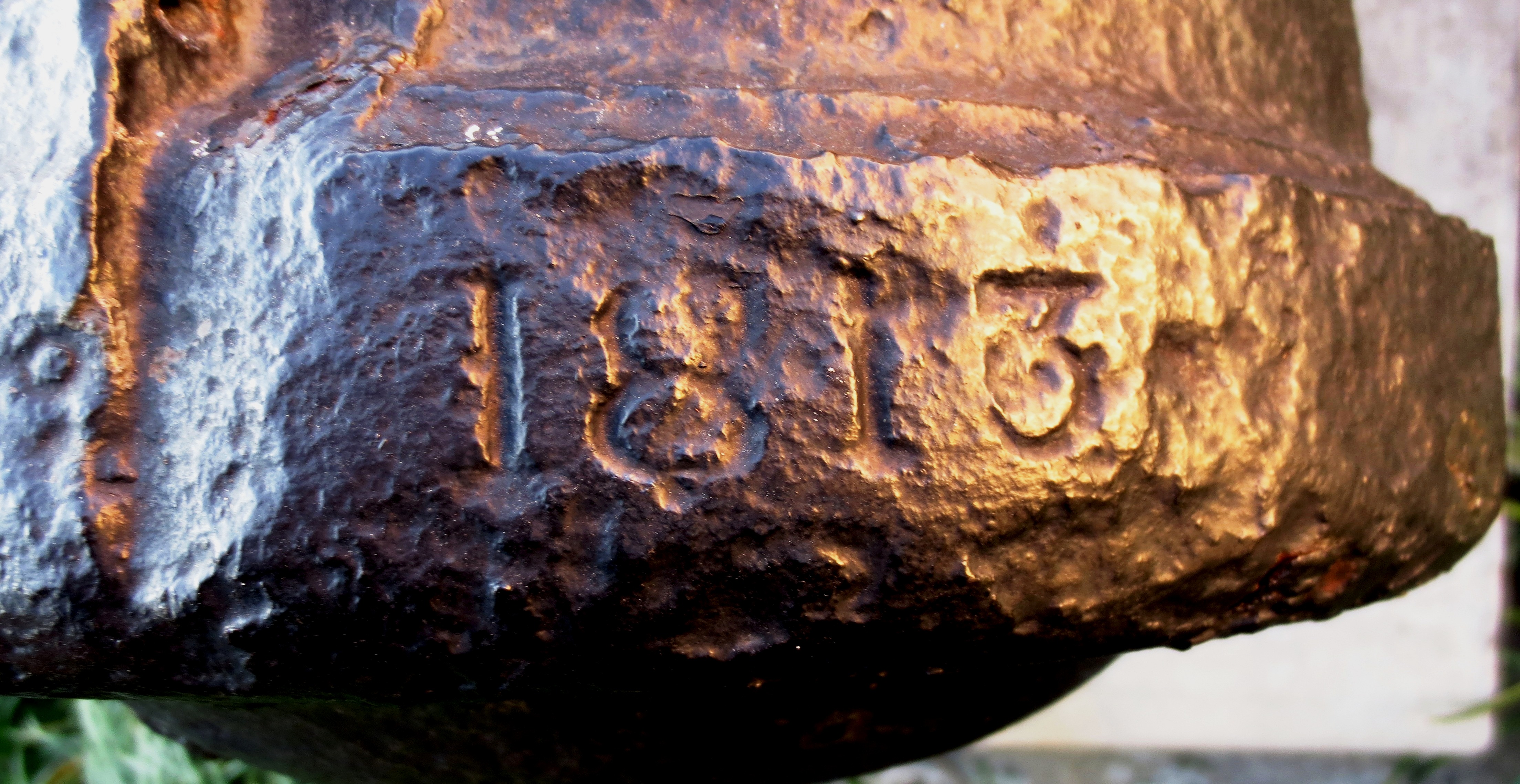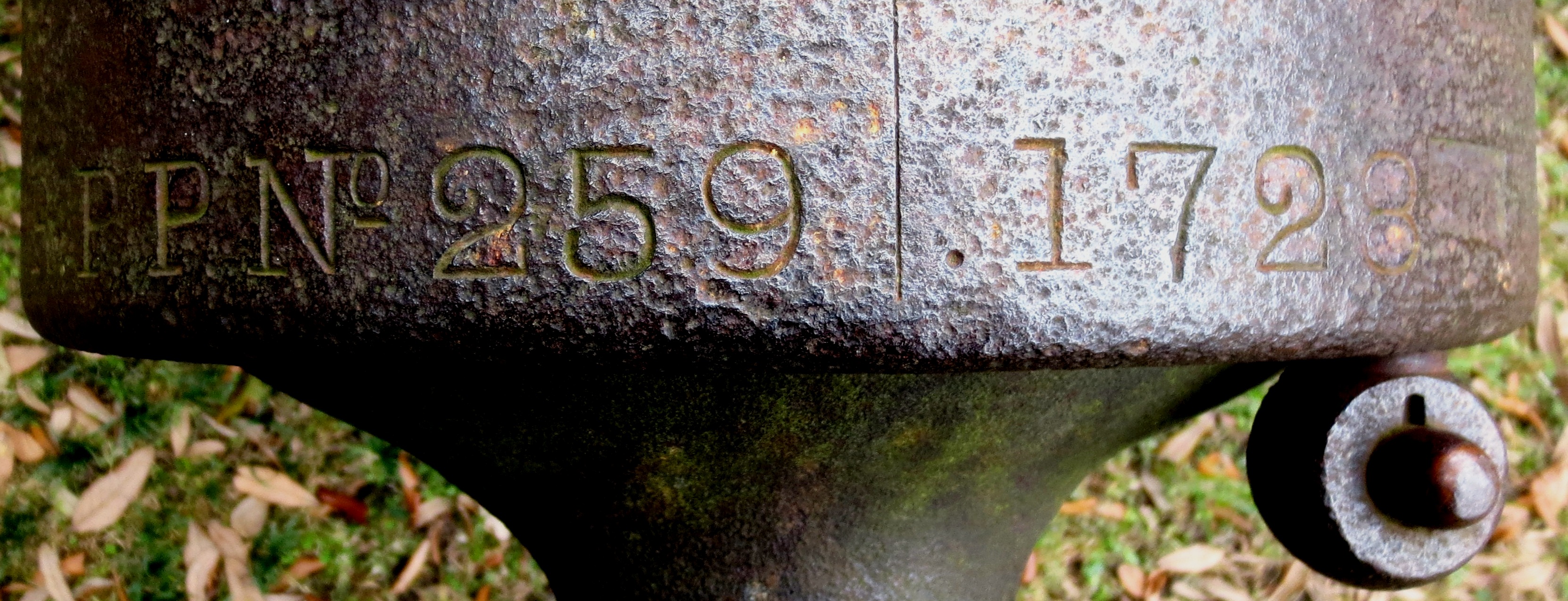 Spanish SBML Gun, weight 51-2-21 (5, 789 lbs), Serial No. 19 on trunnions, mounted on a Naval carriage, guarding the front of the Louisiana State Museum.