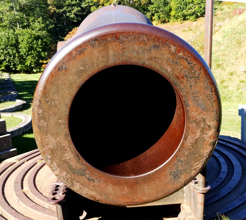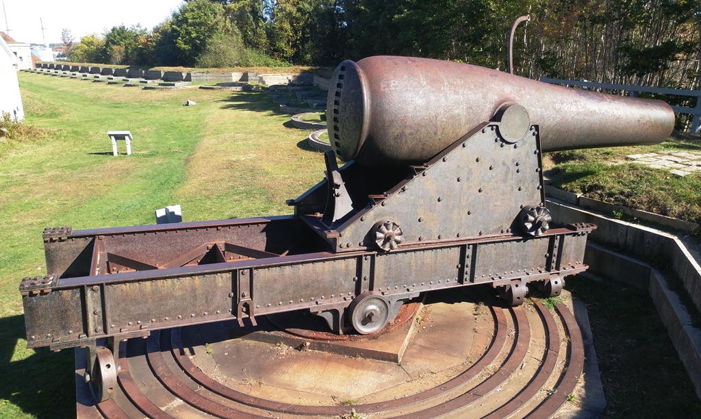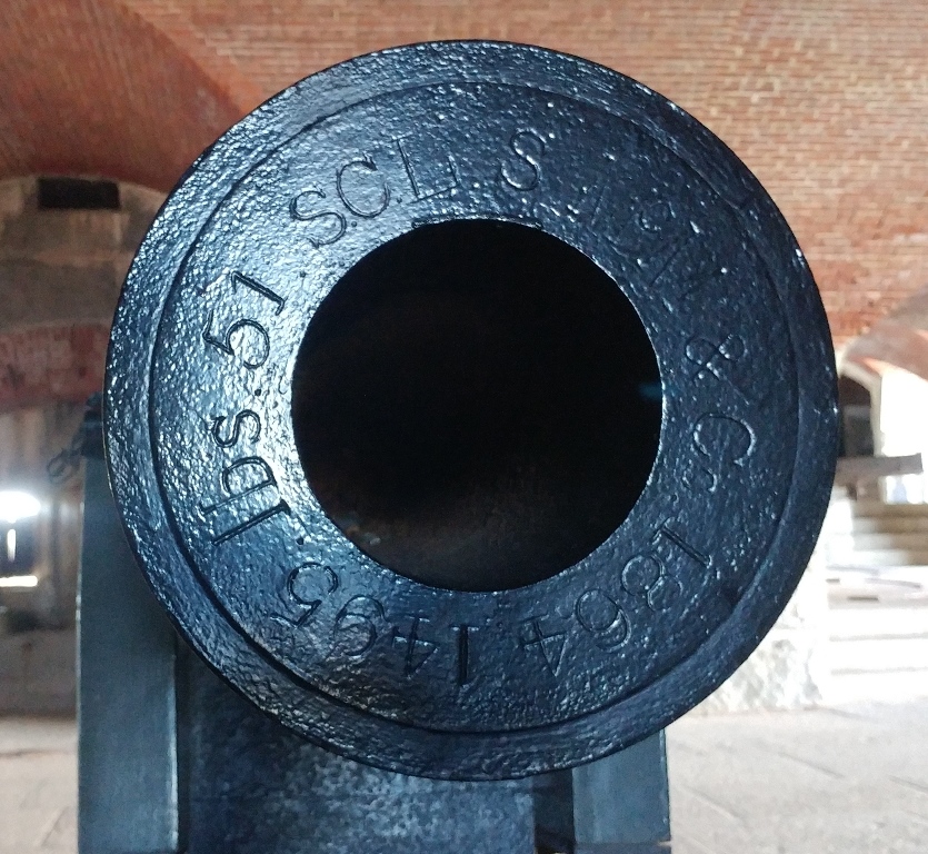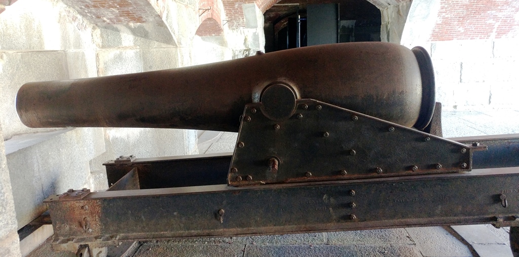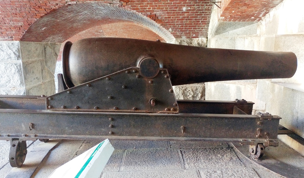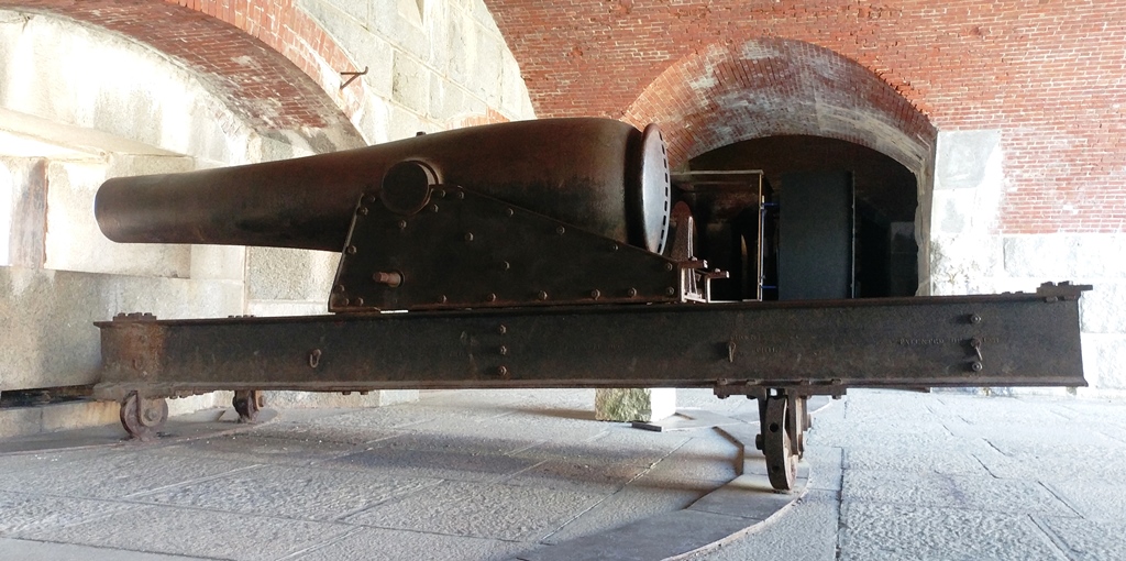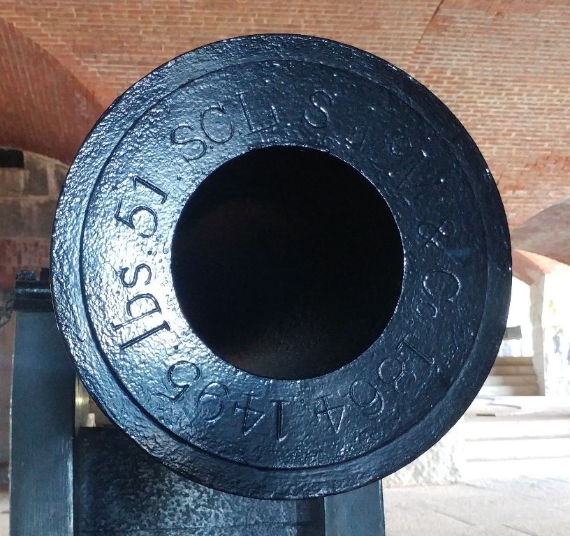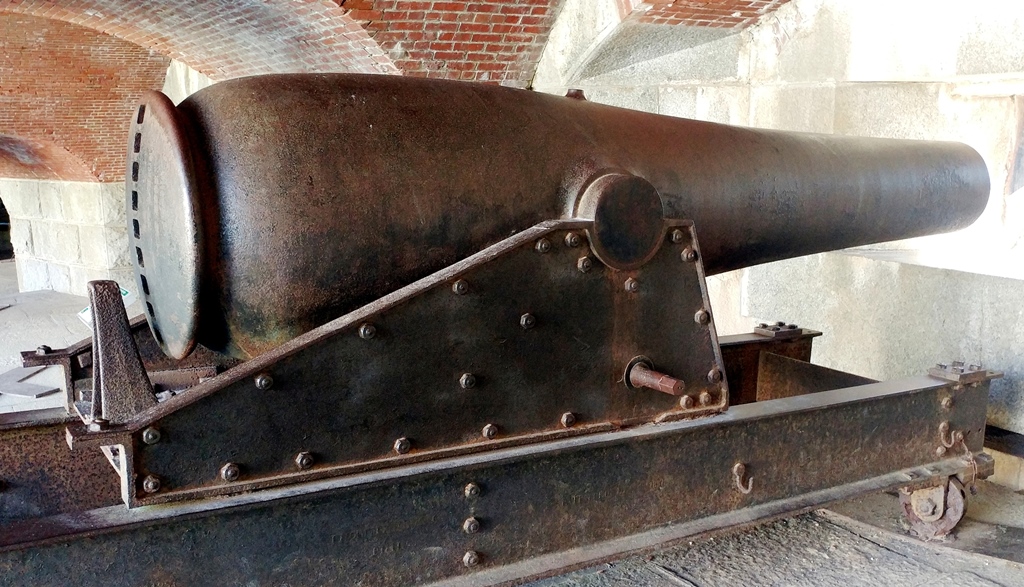 15-inch Rodman Gun, (Columbiad, 15-inch, smoothbore, seacoast, Model 1861), Serial No. 83, C.A. & Co., 49,554 lbs, J.G.B. 1865 on the muzzle, mounted on an iron rotating gun carriage, C Battery, Southeast Corner of the forward fortress gun emplacements.