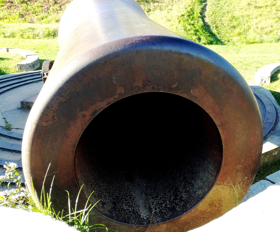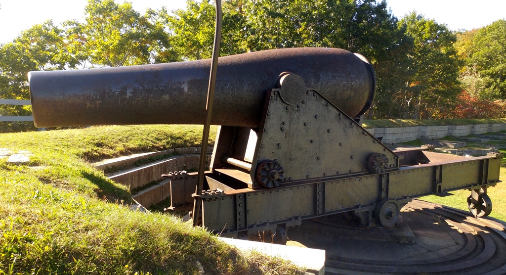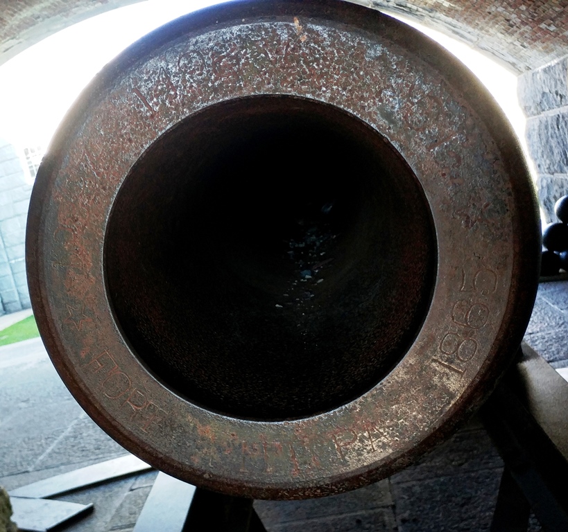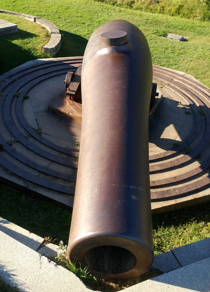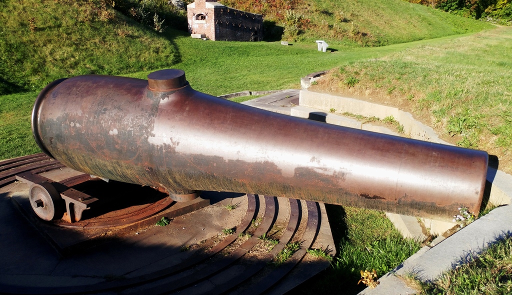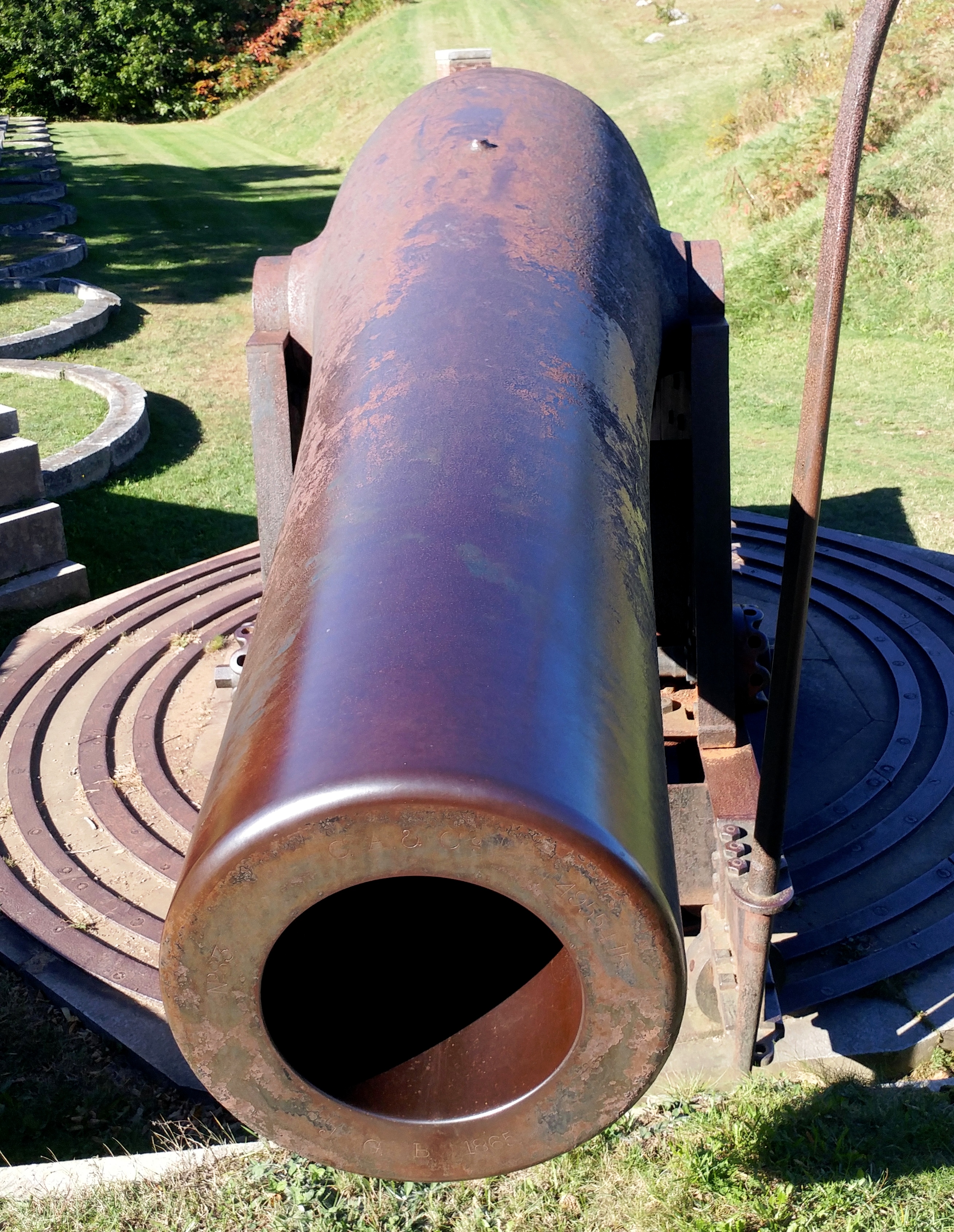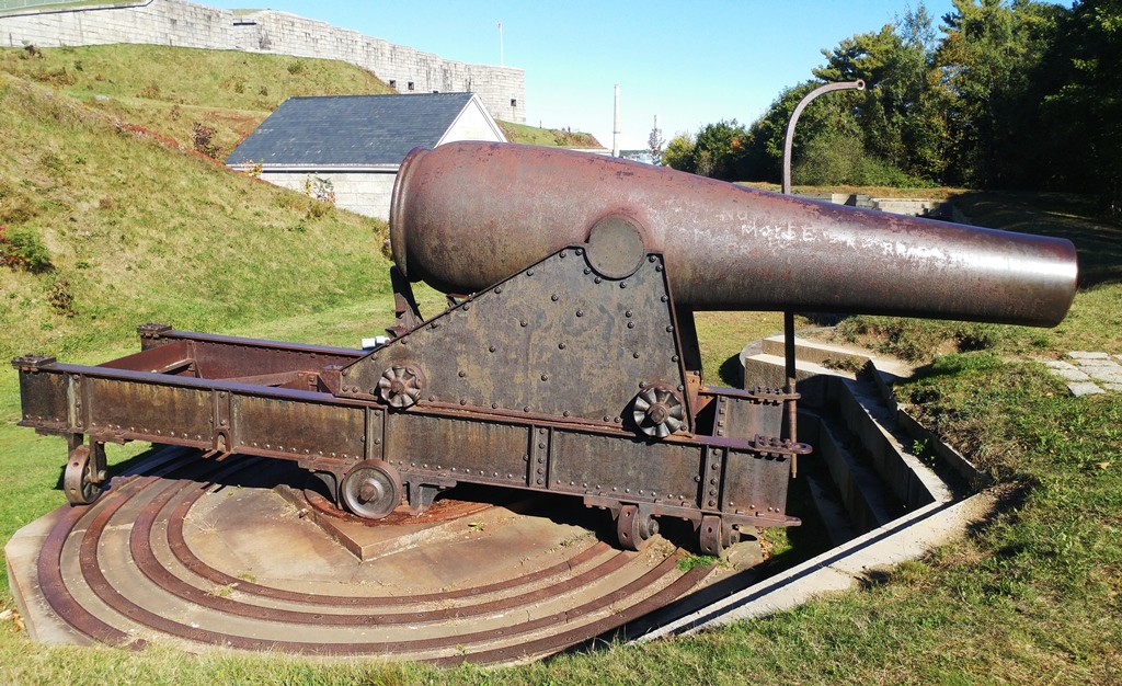 15-inch Rodman Gun, (Columbiad, 15-inch, smoothbore, seacoast, Model 1861), Serial No. 83, C.A. & Co., 49,554 lbs, J.G.B. 1865 on the muzzle, mounted on an iron rotating gun carriage, C Battery, Southeast Corner of the forward fortress gun emplacements.