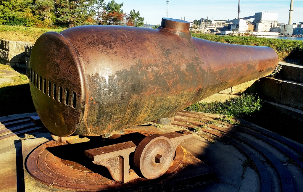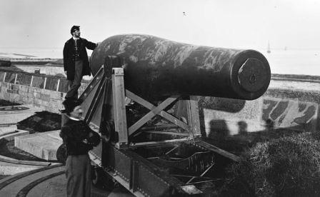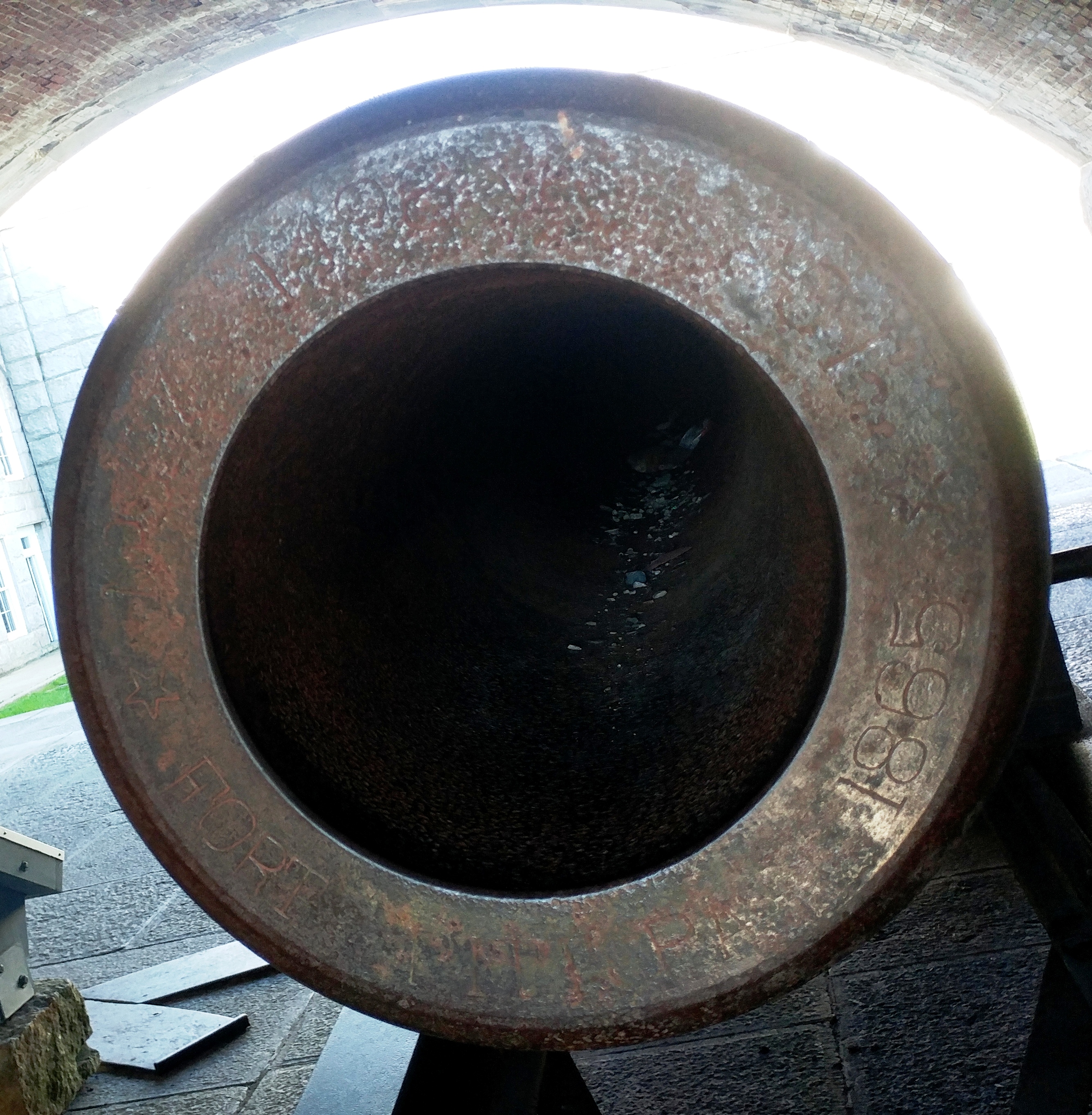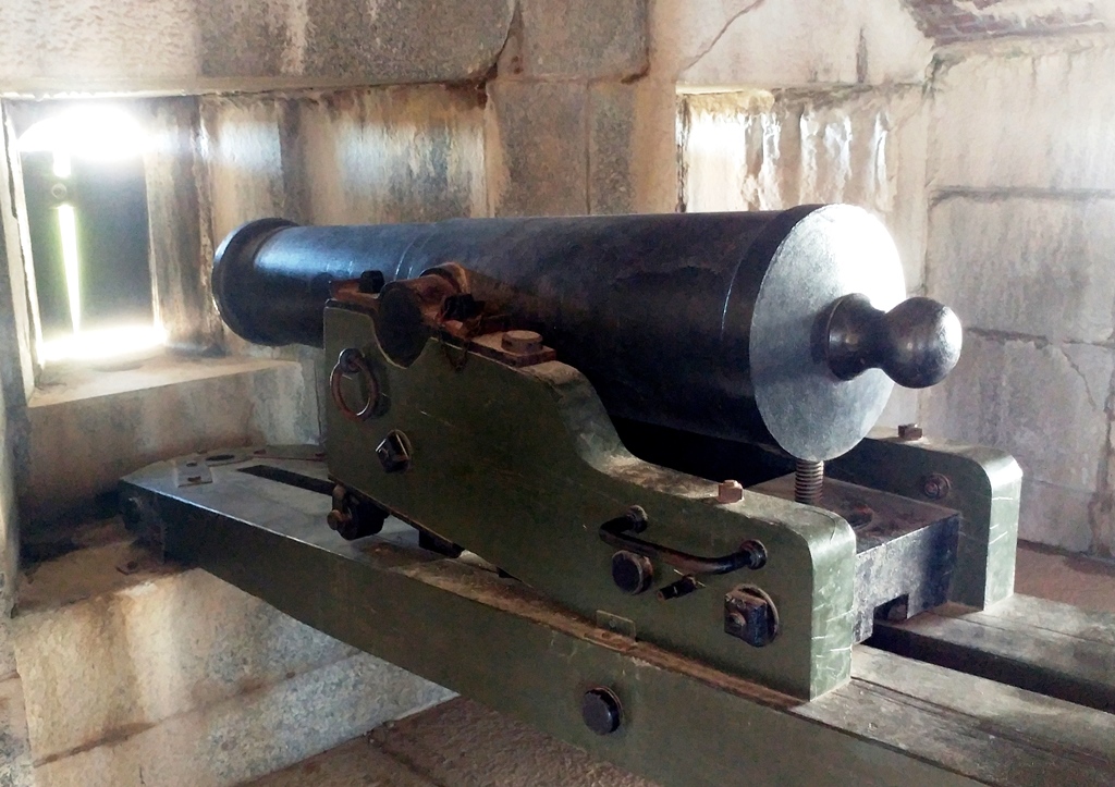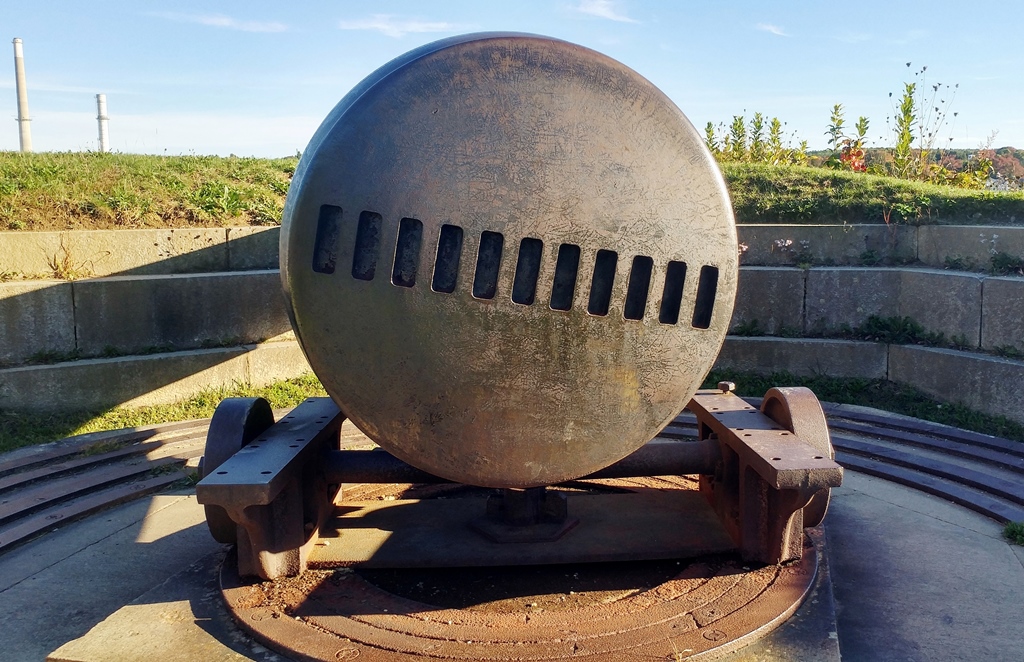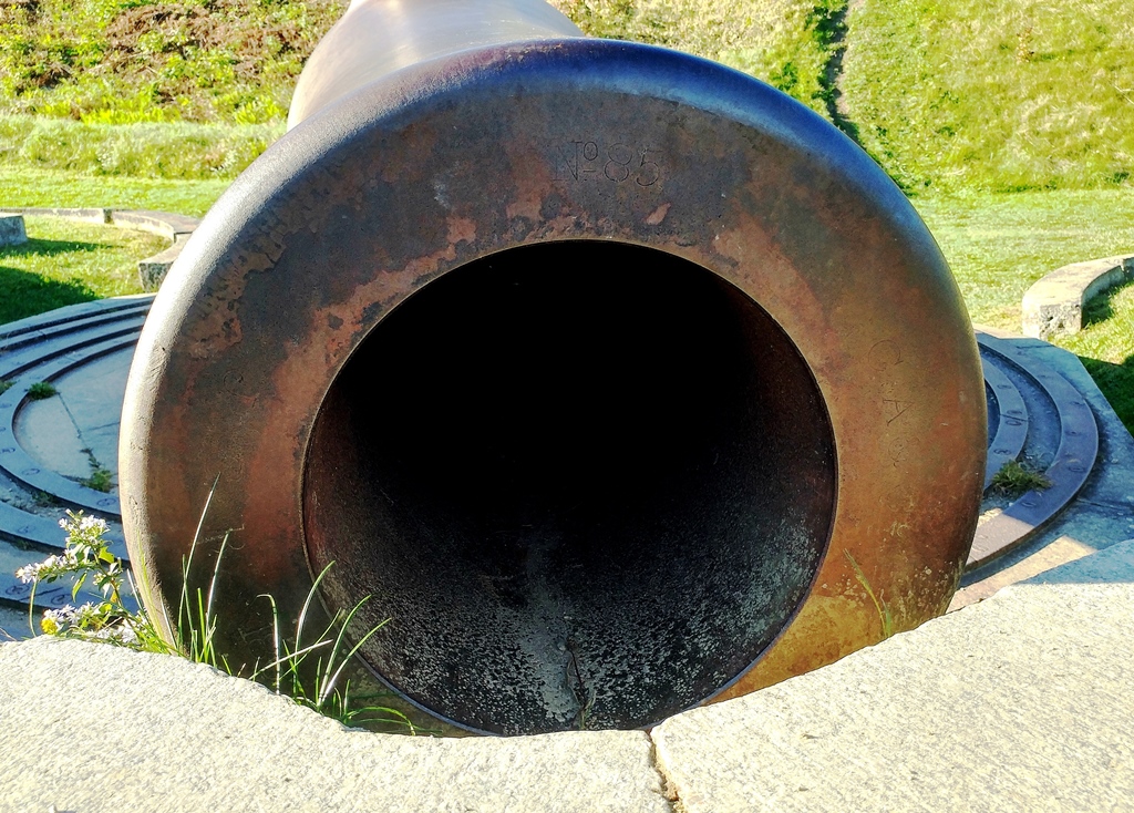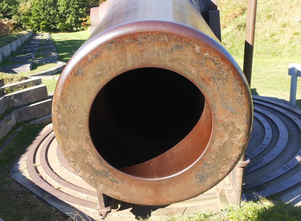 15-inch Rodman Gun, (Columbiad, 15-inch, smoothbore, seacoast, Model 1861), Serial No. 83, C.A. & Co., 49,554 lbs, J.G.B. 1865 on the muzzle, mounted on an iron rotating gun carriage, C Battery, Southeast Corner of the forward fortress gun emplacements.
