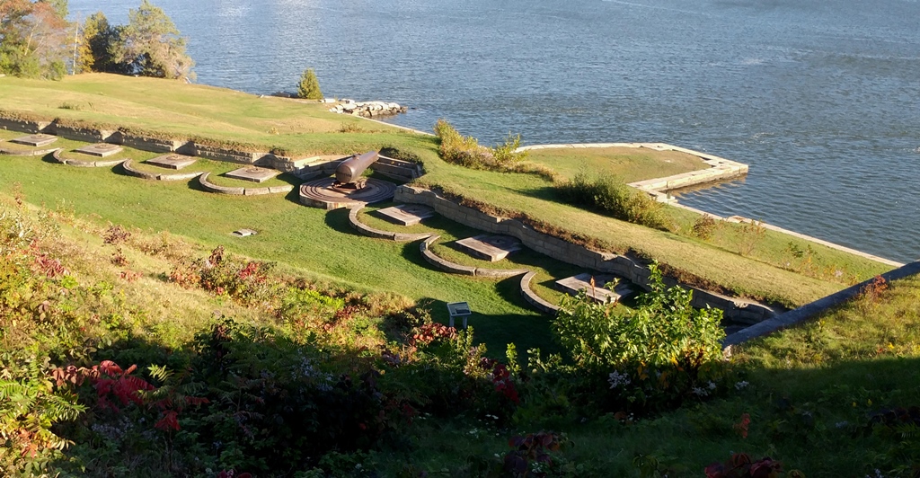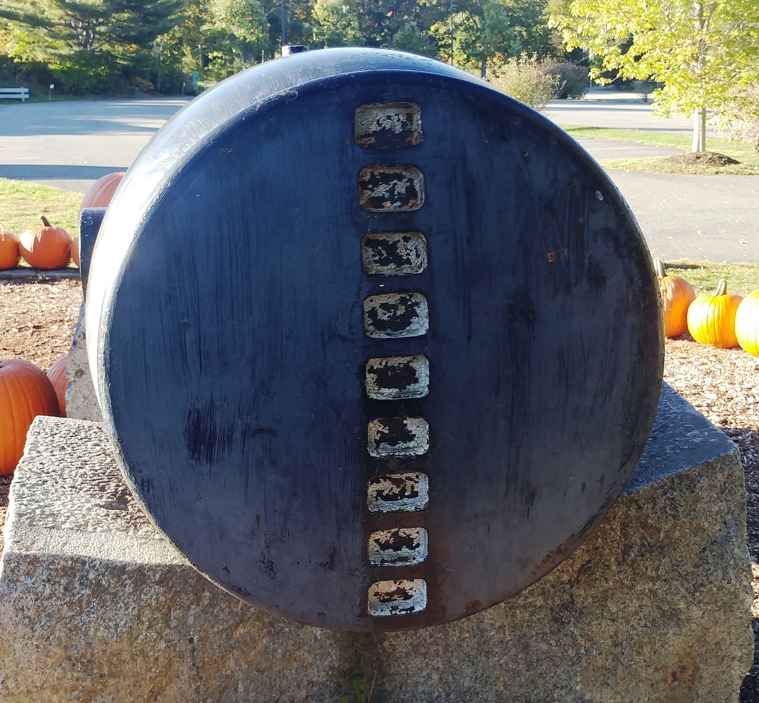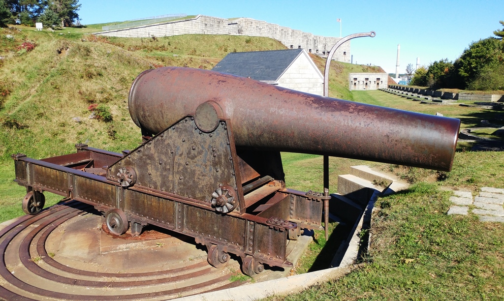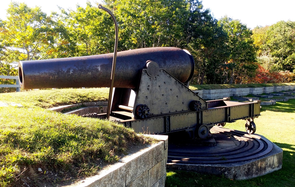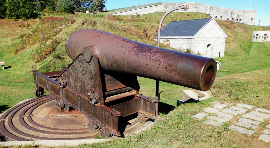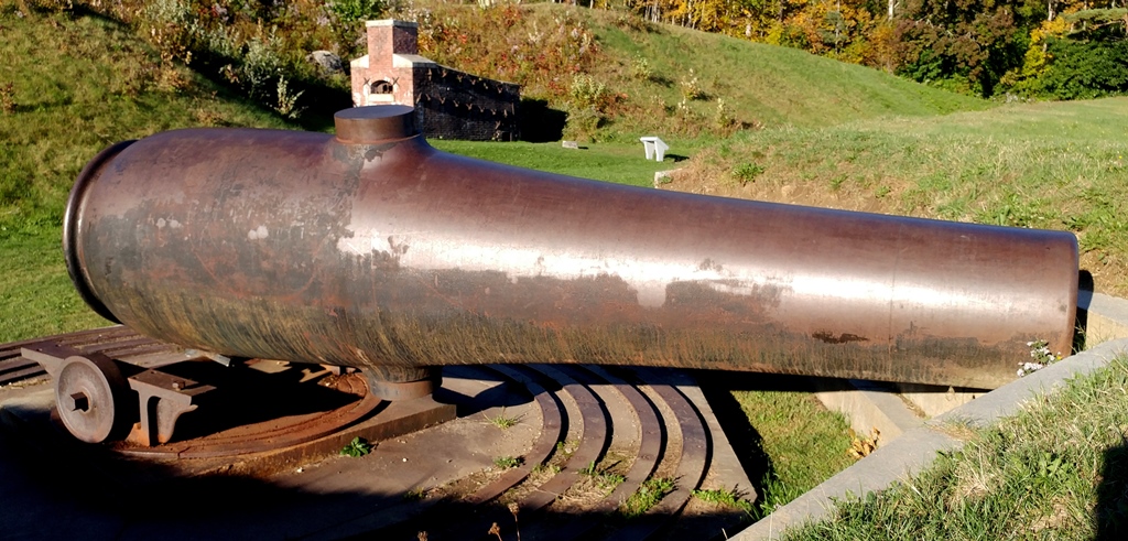 8-inch Rodman Gun (Columbiad, 8-inch, smoothbore, seacoast, Model 1844), Serial No. 85, 16, 160 lbs, S.B.F. 1879 on the muzzle, converted rifle, resting on a pair of stone blocks at the entrance to the Fort Knox site.