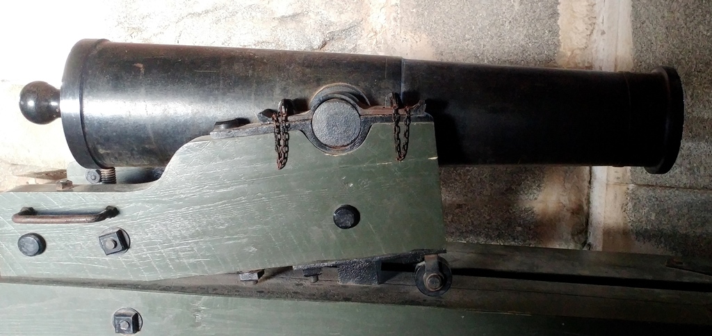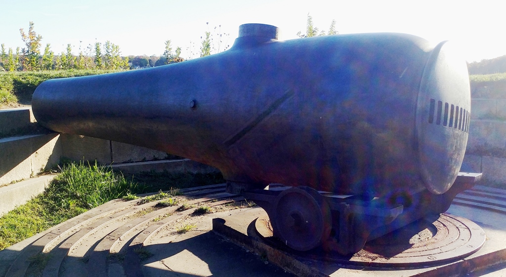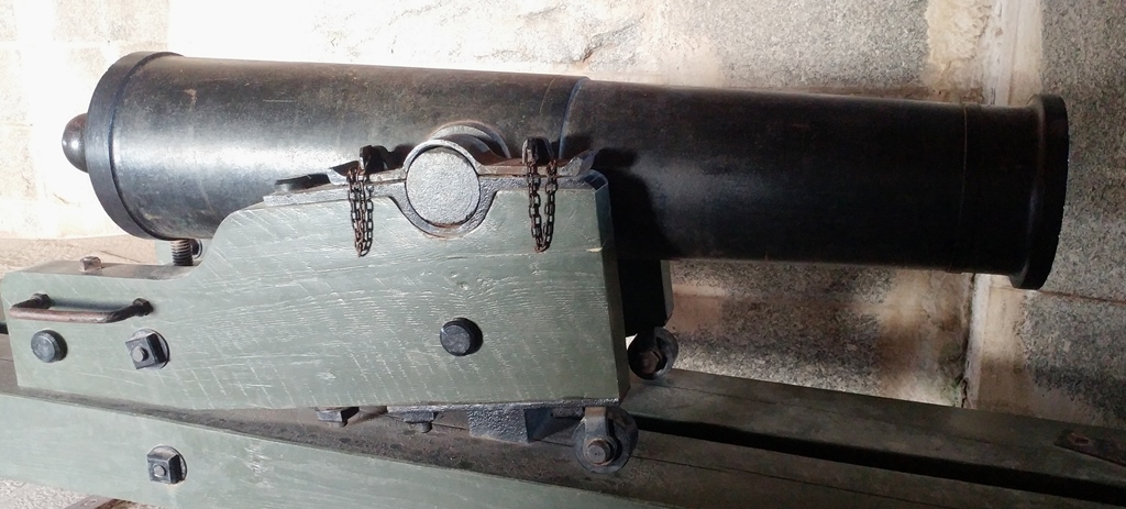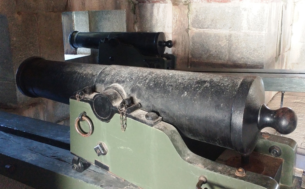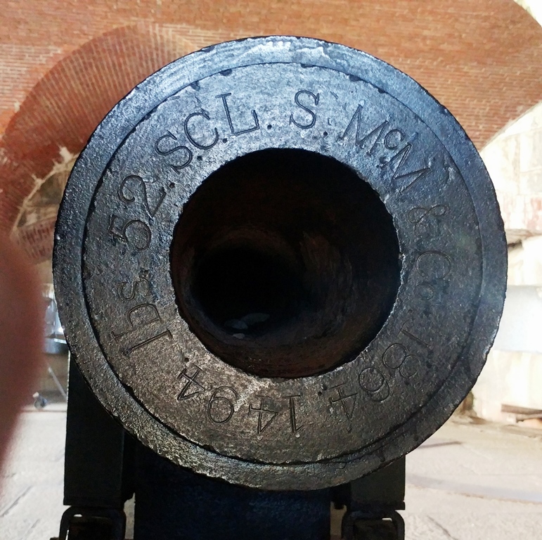 Cast-iron 24-pounder M1844 smoothbore muzzle-loading Siege and Garrison Howitzer, Serial No. 52, S.C.L.S. McM & Co, 1864, 1,494 lbs on the muzzle, mounted on a traversing wood gun carriage. These guns were used to cover blind approaches and moats around masonry fortifications, specifically the flanks of the walls, thereby earning the nick-name “Flank Howitzer”. Facing South, No. 1 of 3.