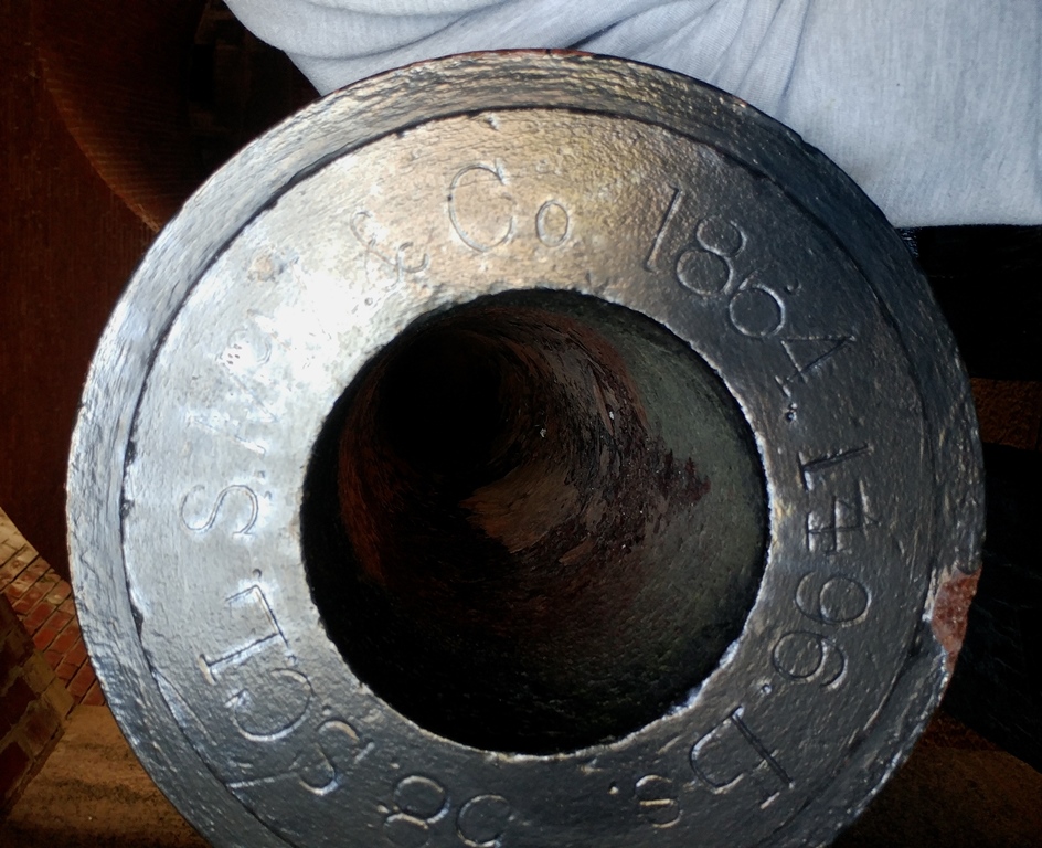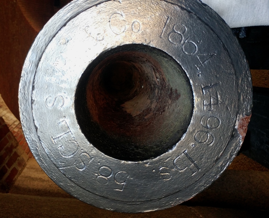 15-inch Rodman Gun, (Columbiad, 15-inch, smoothbore, seacoast, Model 1861), Serial No. 85, C.A. & Co., 49,362 lbs, J.G.B. 1865 on the muzzle, unmounted, laying on its left side on wood blocks, B Battery, Northeast Corner of the forward fortress gun emplacements.