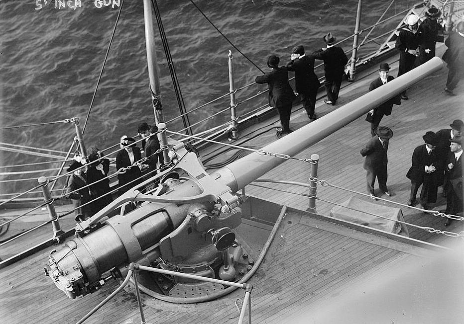 5″/51 caliber (127-mm) naval gun, possibly on USS Texas B-35, between 1910 and 1915.  These guns weighed 5 metric tons, and had a range of 14.5 km (15,850 yards) at the maximum elevation of 20 degrees.  The 5-inch/51 caliber gun was designed to engage destroyers, torpedo boats, and other surface targets.  It entered USN service in 1911.