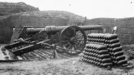Two 30-pounder Parrott Rifles and stacks of shells inside Fort Putnam, South Carolina.