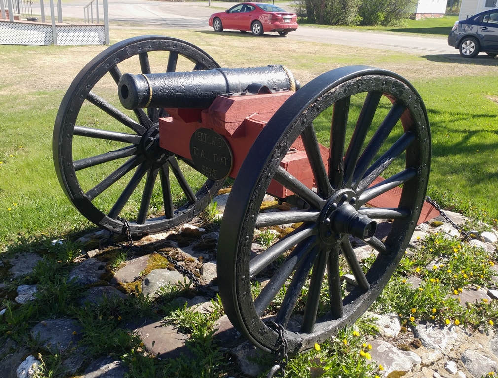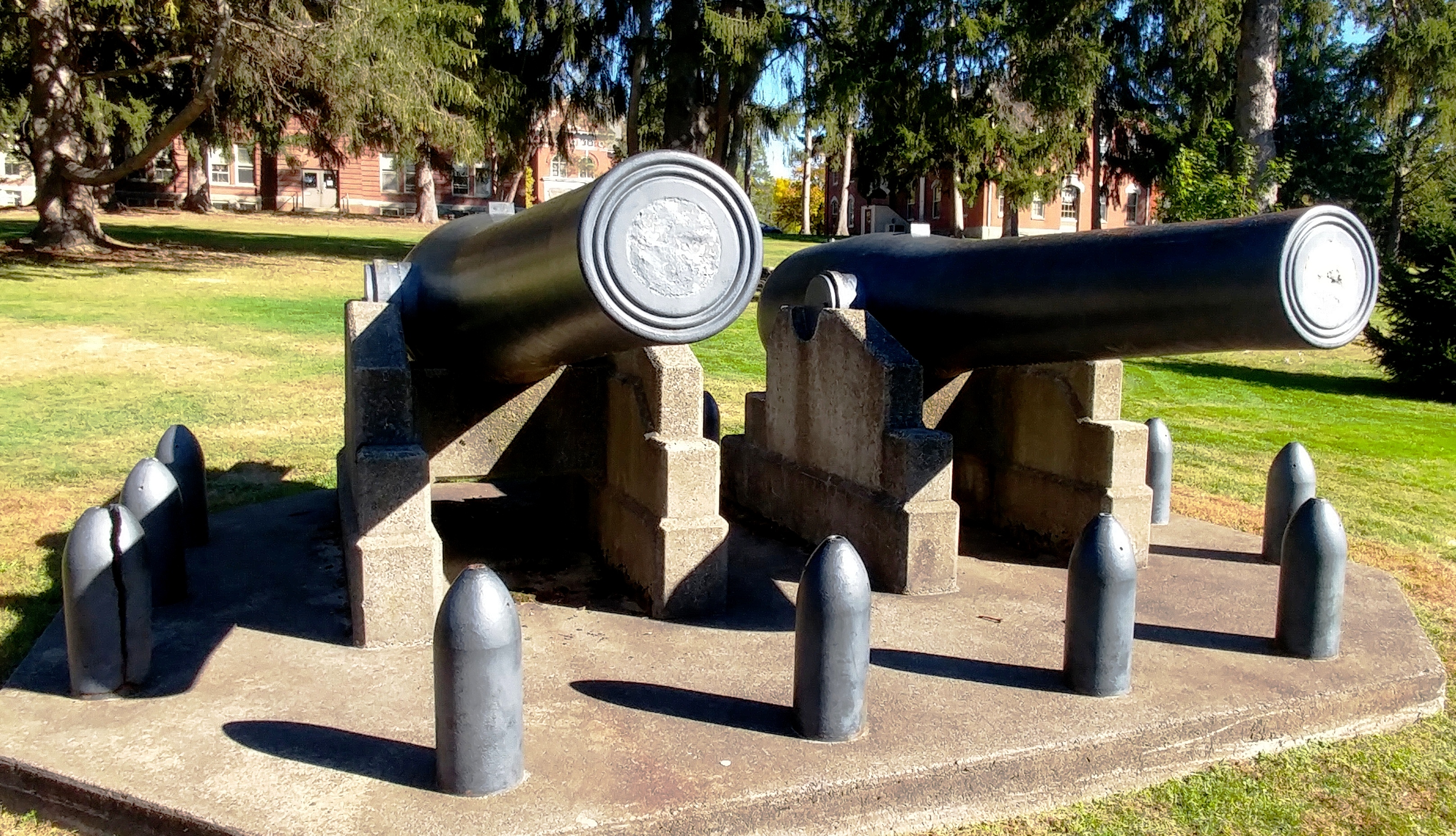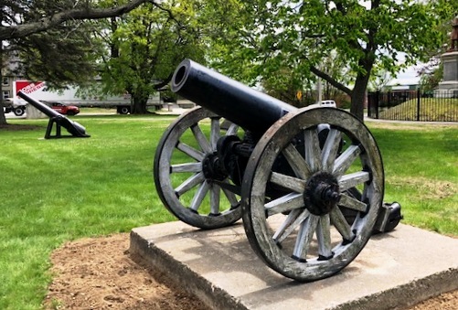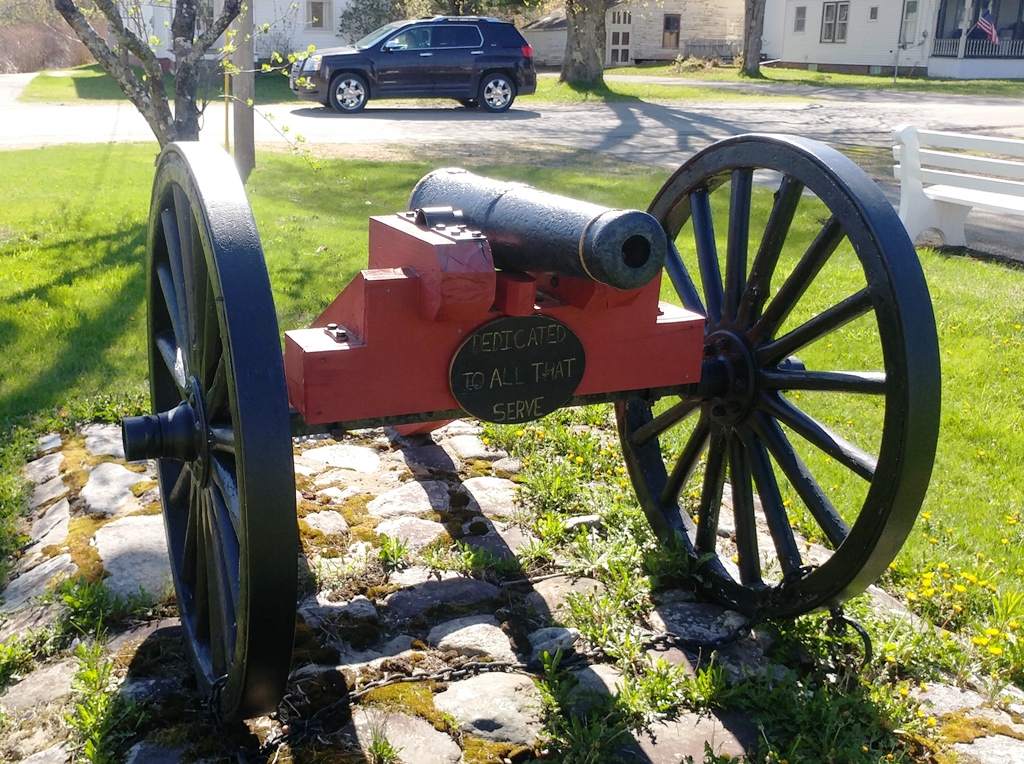Cast-iron 1-pounder smoothbore muzzle-loading Gun “Old Zack”, mounted on a wheeled carriage, beside the War Memorial.  This gun is likely pre-civil war vintage.
