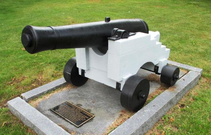 Cast-iron 32-pounder smoothbore muzzle-loading Carronade with a Blomefield pattern breeching ring, mounted on a wood naval gun carriage facing the harbour at Lincolnville Beach.  It has a bronze plaque which reads, “This cannon was stationed at Lincolnville beach for the protection of this village during the War of 1812.  Restored to this original location on May 18, 1957 by Edwin W. Kibbe who gave it to the people of the Town of Lincolnville”.