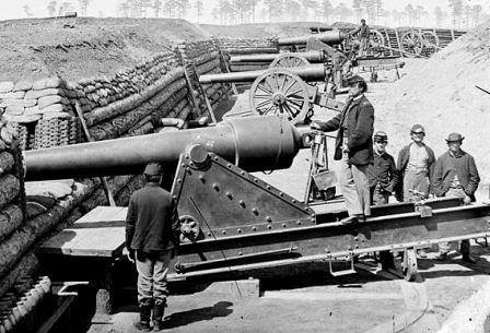 Two 100-pounder Parrott rifles (Parrott, 6.4-inch, rifle, seacoast, Model 1861), mounted on an iron front pintle barbette carriages on the flanks, and two 4.2-inch 30-pounder Parrotts, center, mounted on siege carriages, inside Fort Brady during the Siege of Petersburg, Virginia, manned by Company C, 1st Connecticut Heavy Artillery in 1865.  The 6.4-inch rifles are on iron, front pintle, barbette carriages and the 4.2-inch rifles are on siege carriages.