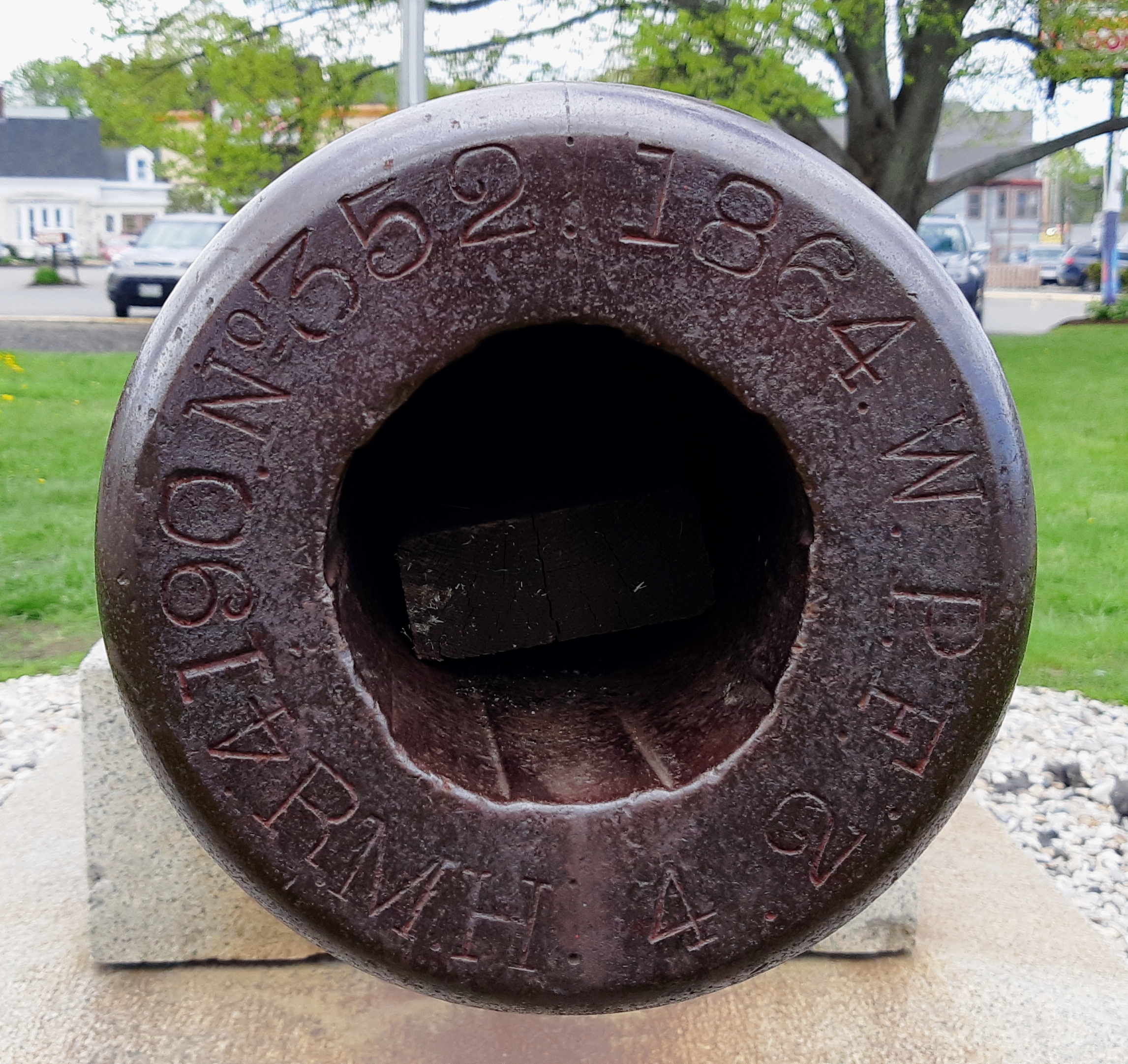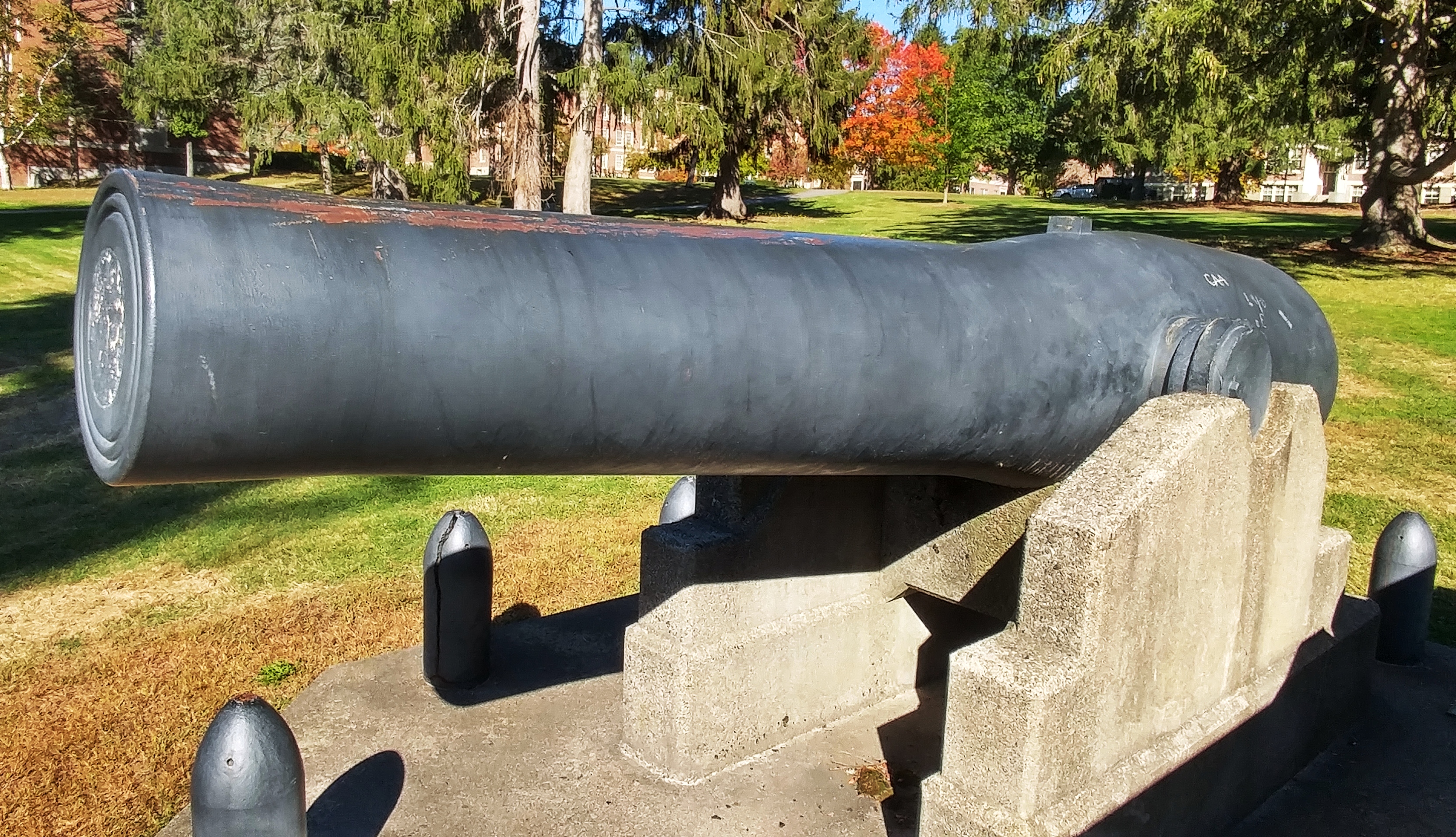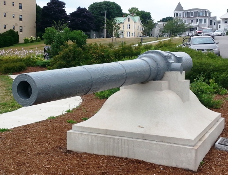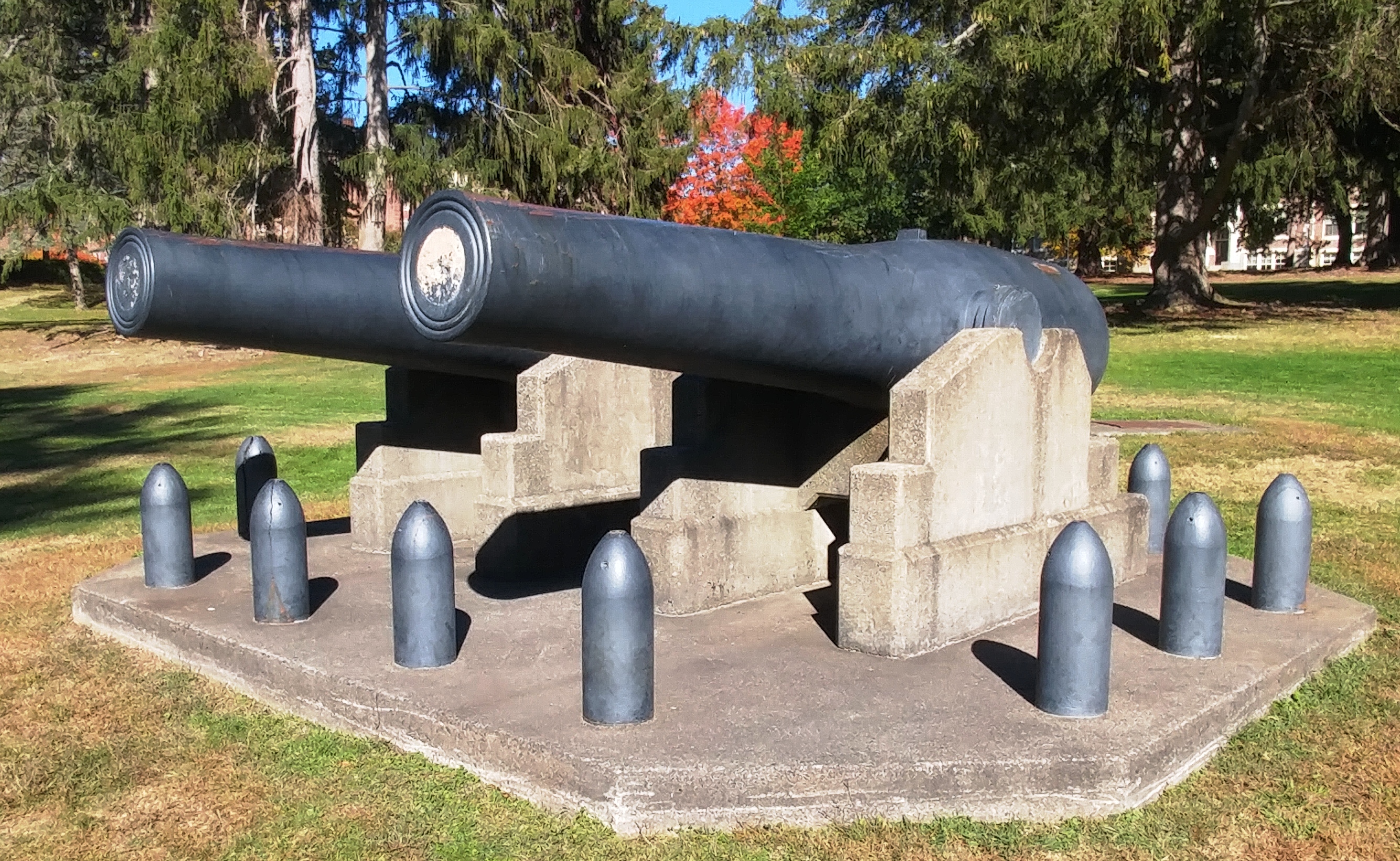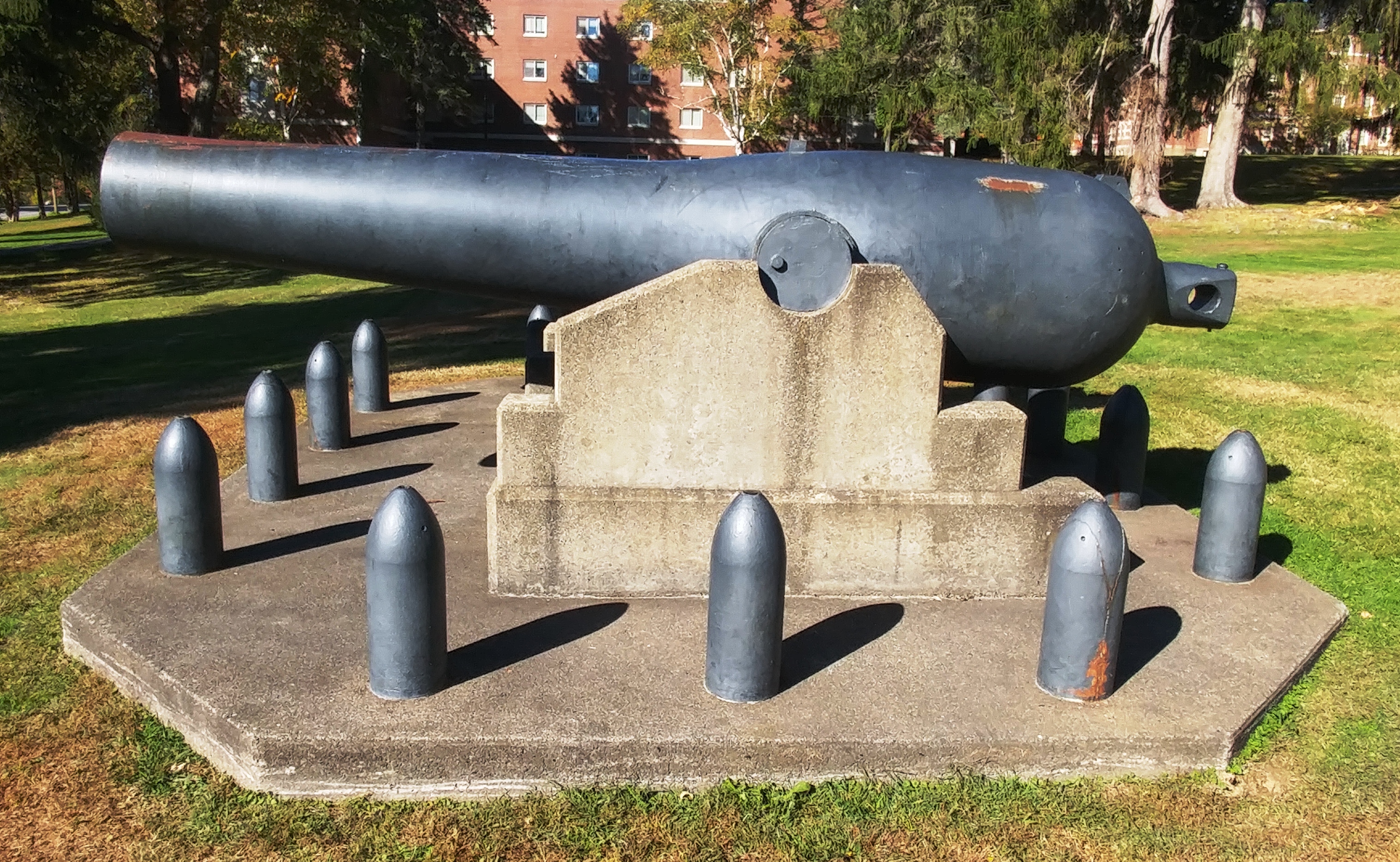 8-inch Rodman Gun (Columbiad, 8-inch, smoothbore, seacoast, Model 1844), weight greater than 9,000-lbs, mounted vertically on a Civil War Memorial at the corner of Knapp and Church Streets.