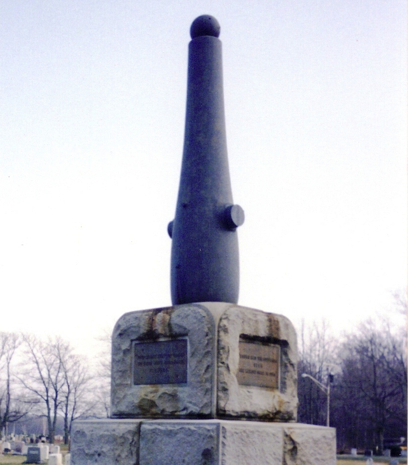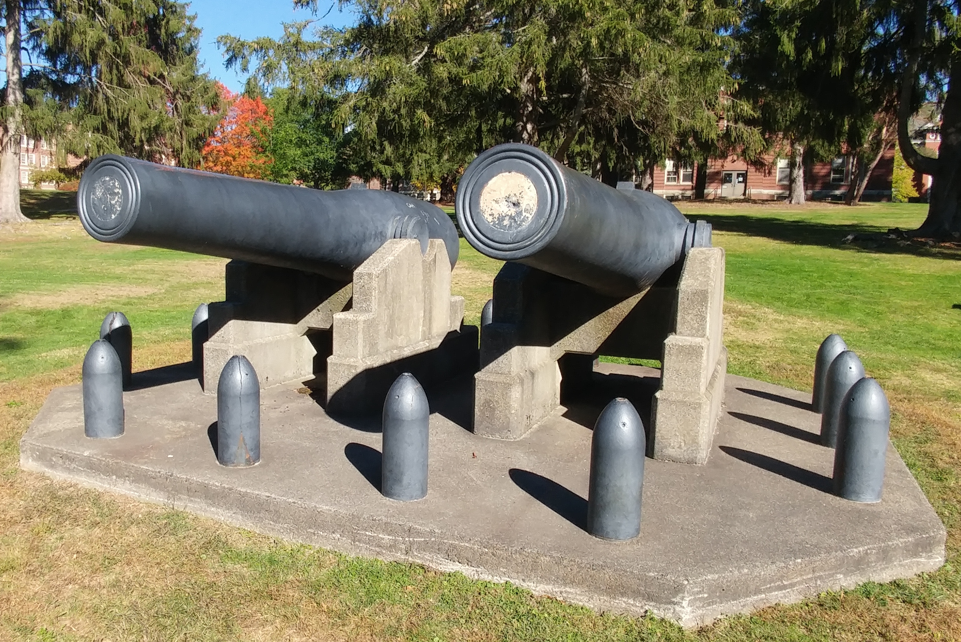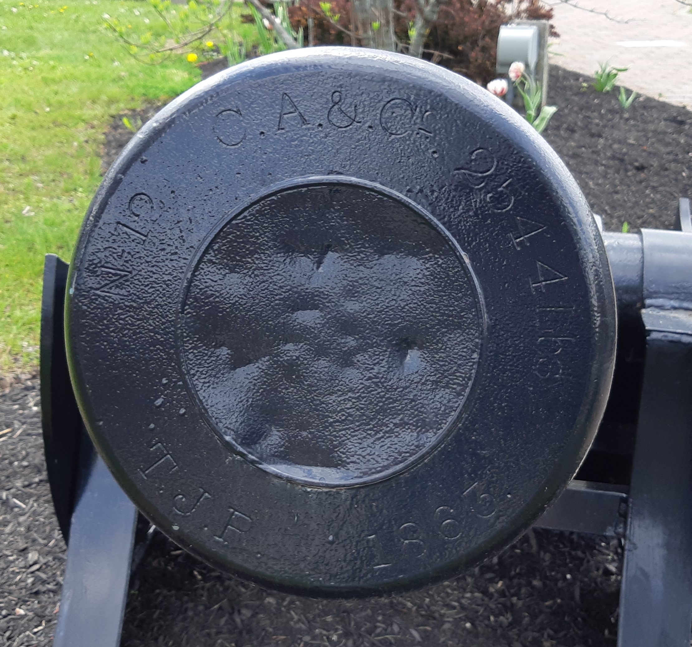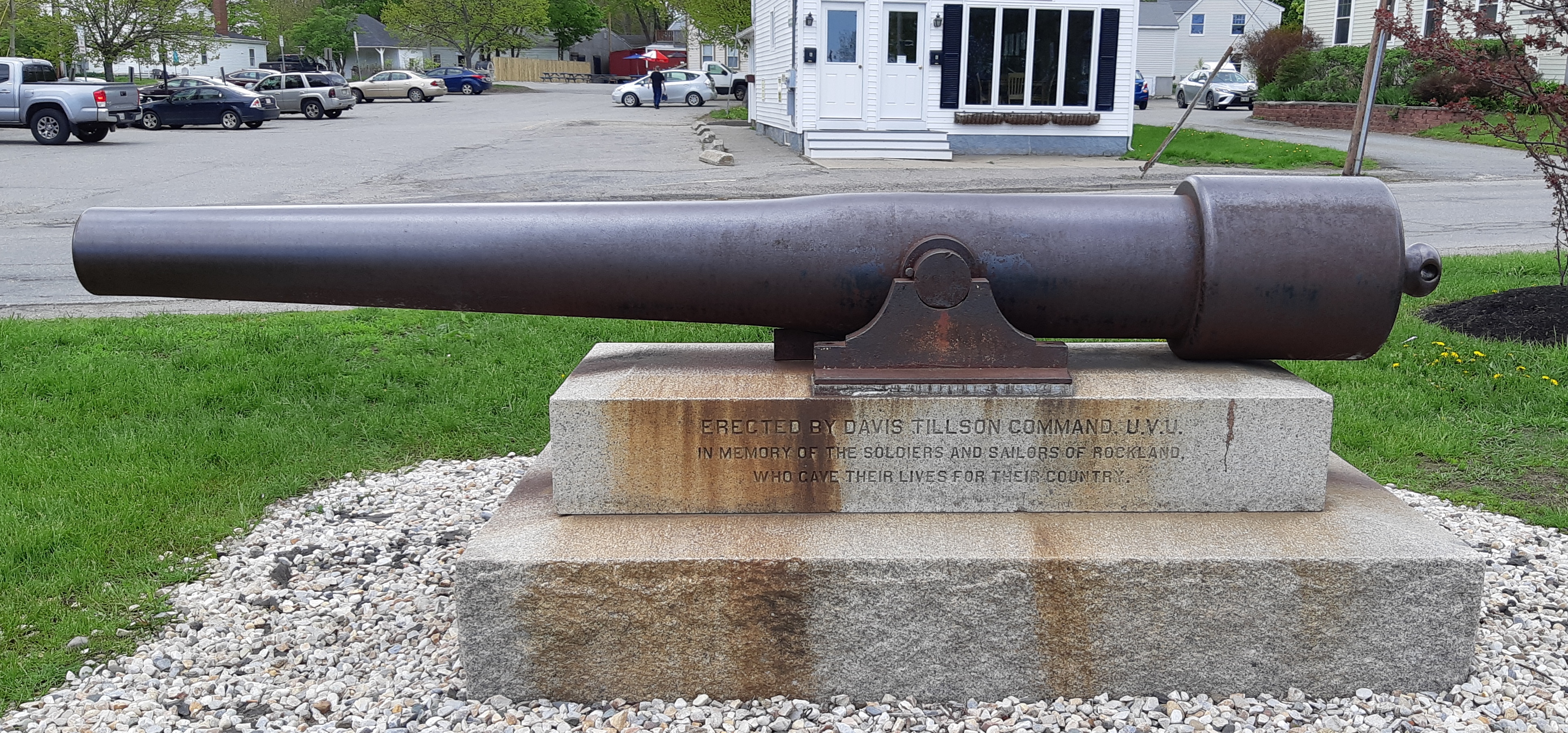 8-inch Rodman Gun (Columbiad, 8-inch, smoothbore, seacoast, Model 1844), weight greater than 9,000-lbs, mounted vertically on a Civil War Memorial at the corner of Knapp and Church Streets.