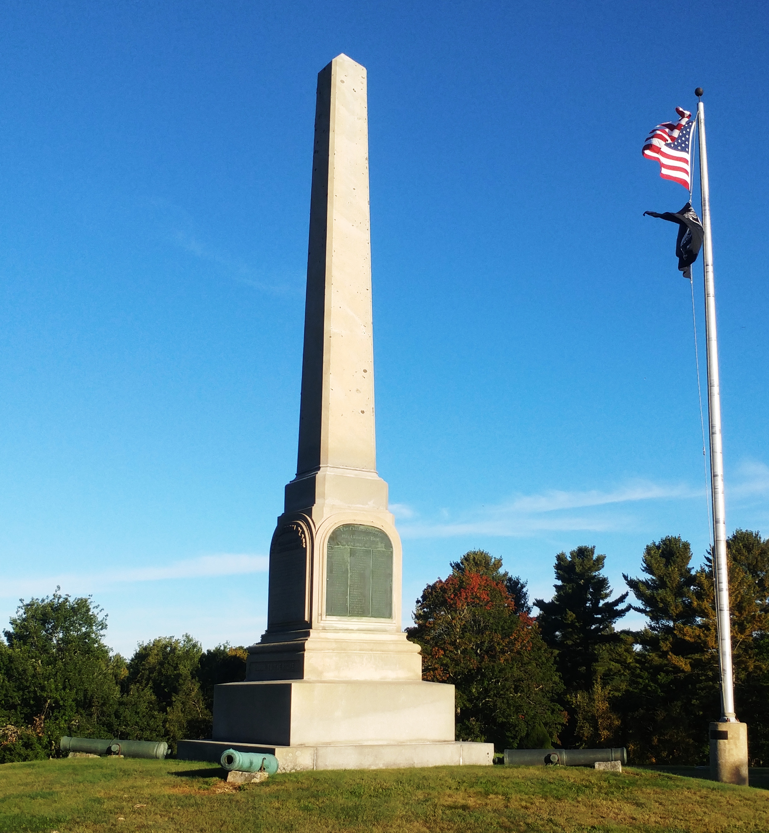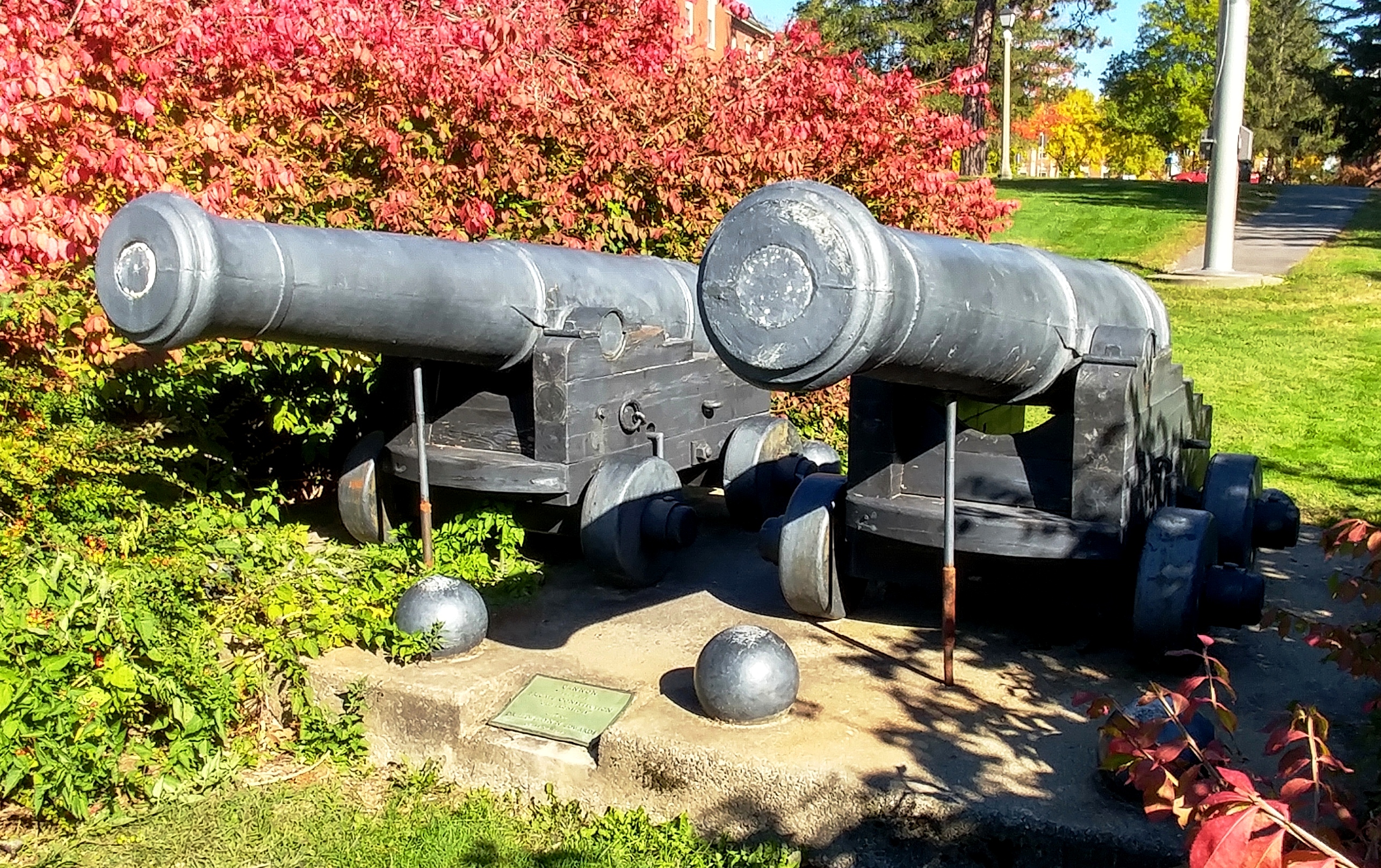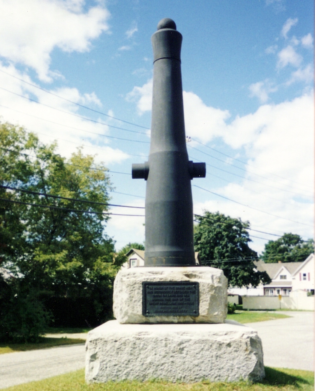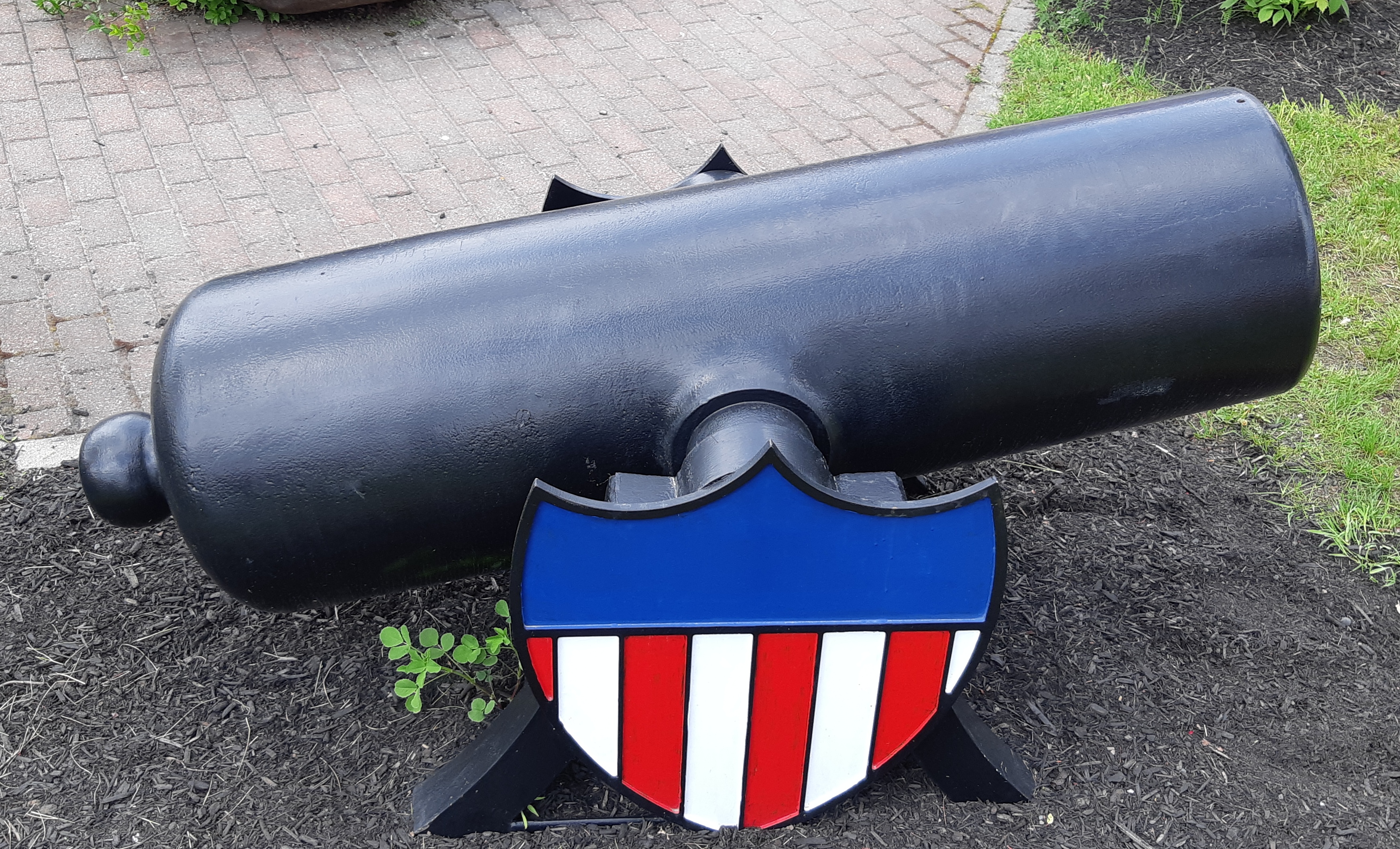 8-inch Rodman Gun (Columbiad, 8-inch, smoothbore, seacoast, Model 1844), weight greater than 9,000-lbs, mounted vertically on a Civil War Memorial at the corner of Knapp and Church Streets.